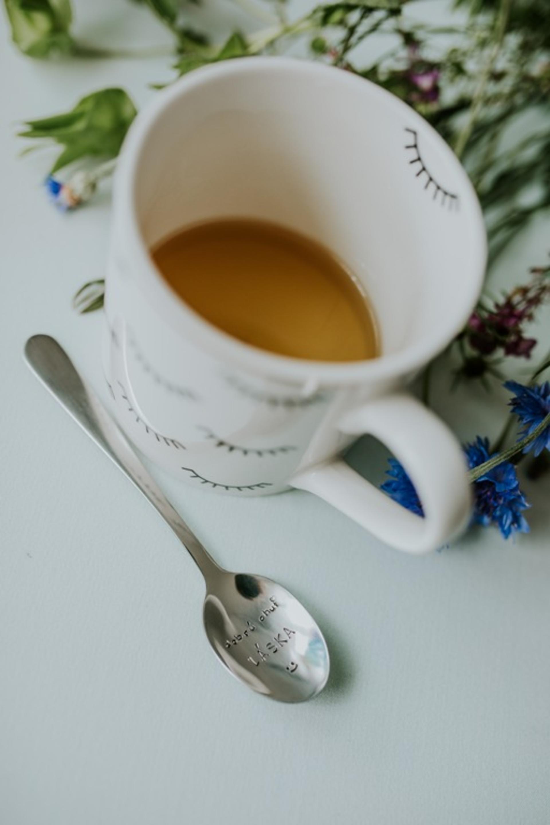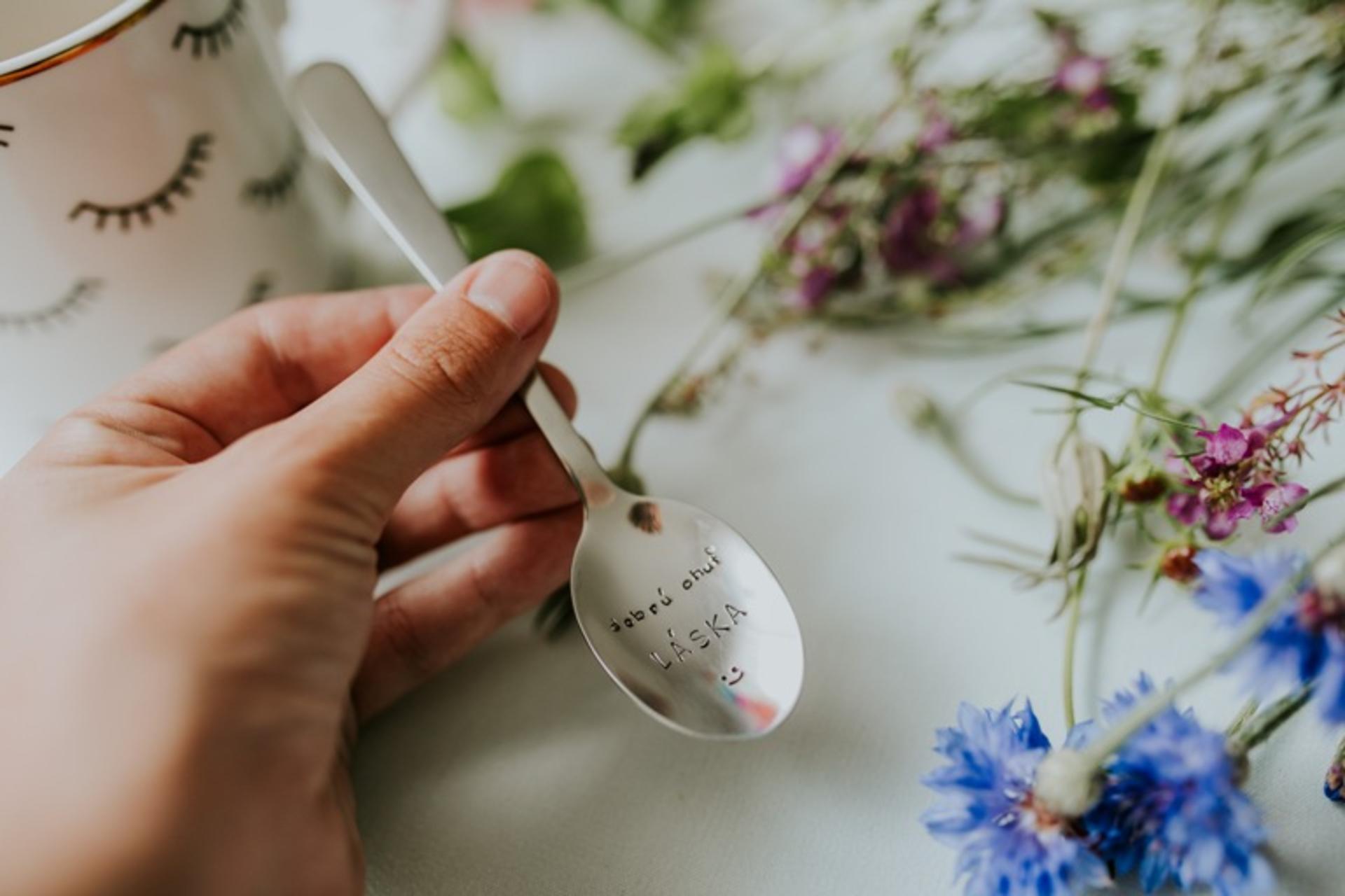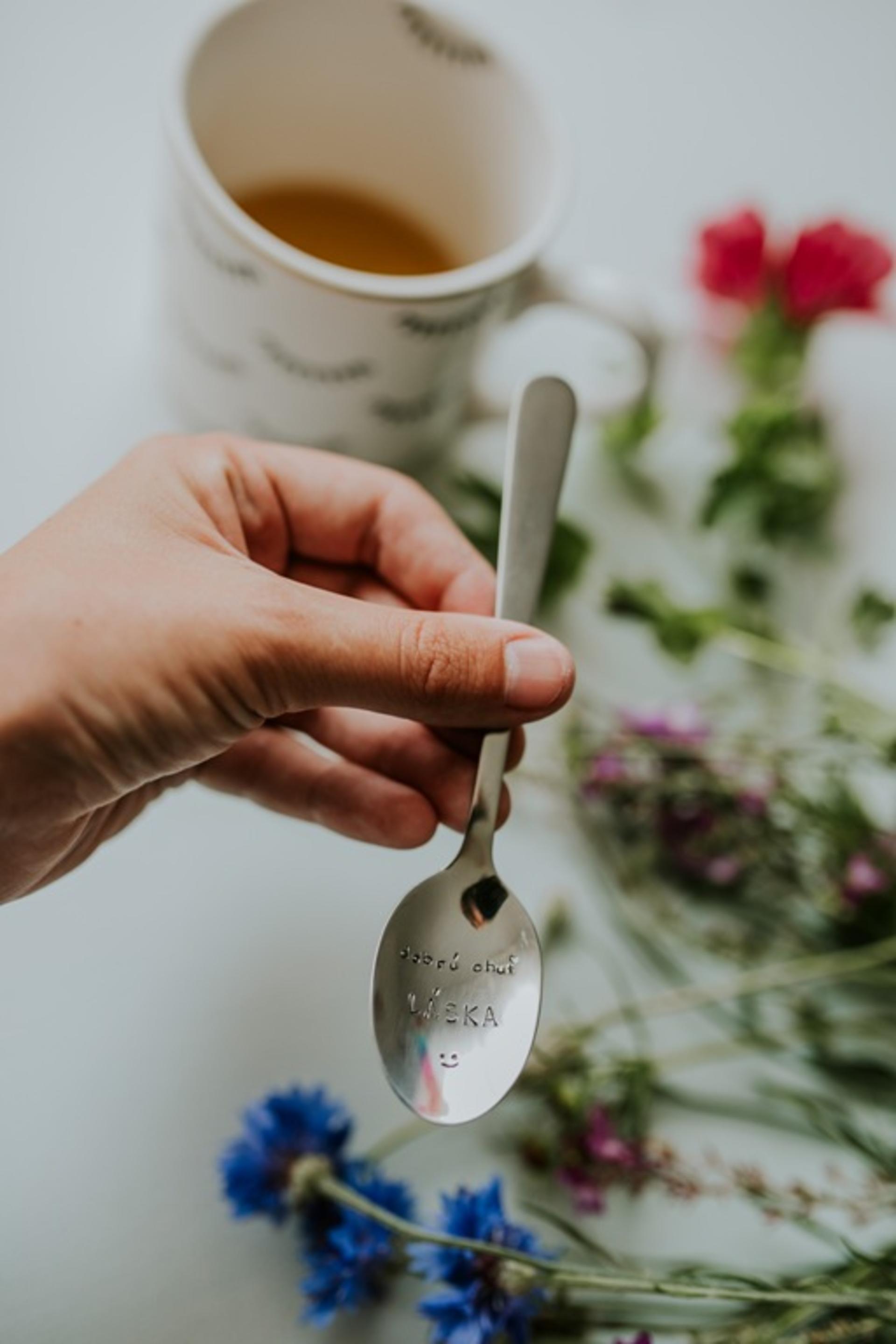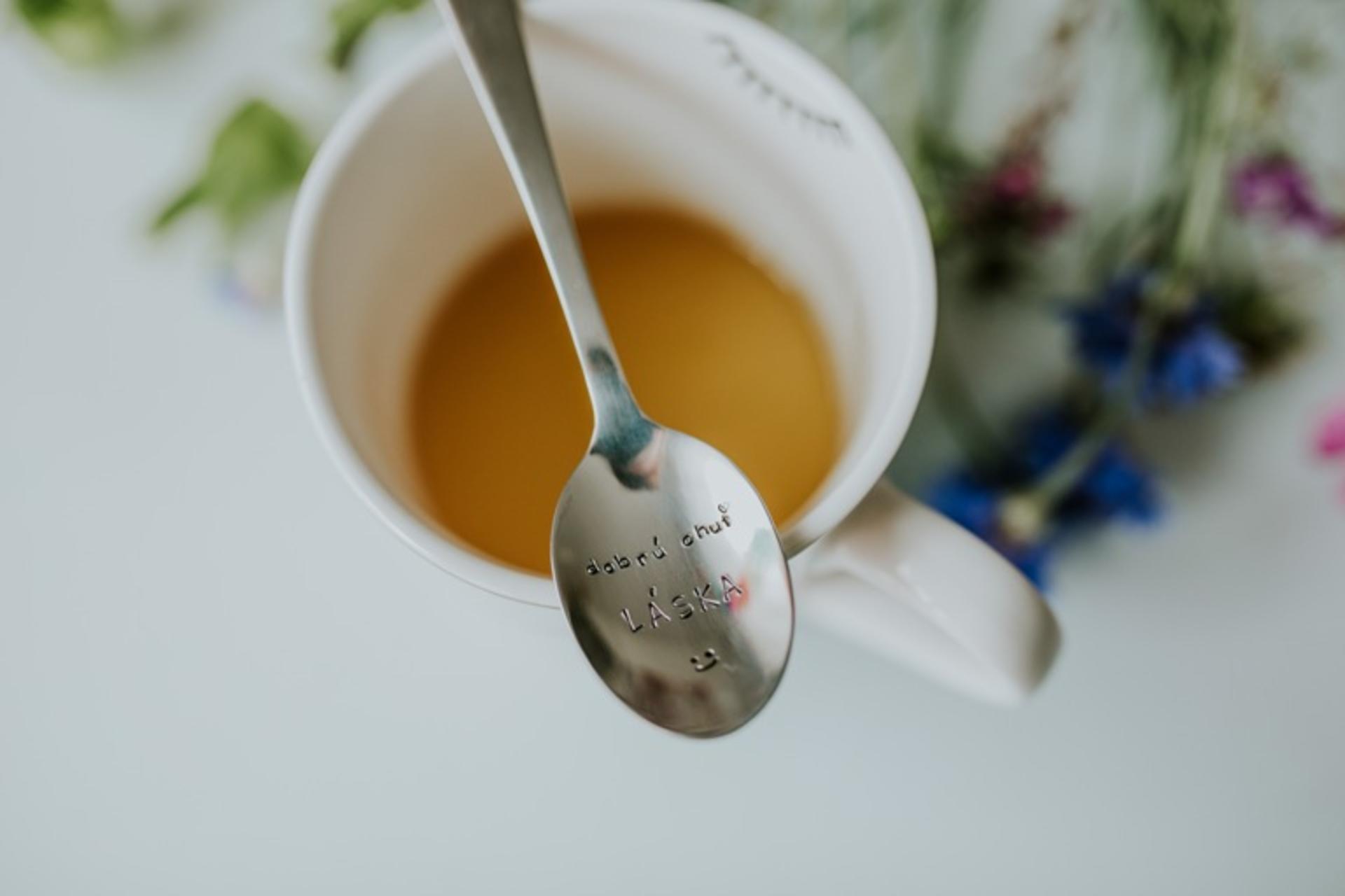 Čajová oceľová lyžička striebornej farby s ručne razeným textom v dolnej naberacej časti lyžičky: "dobrú chuť LÁSKA" doplnený smajlíkom.