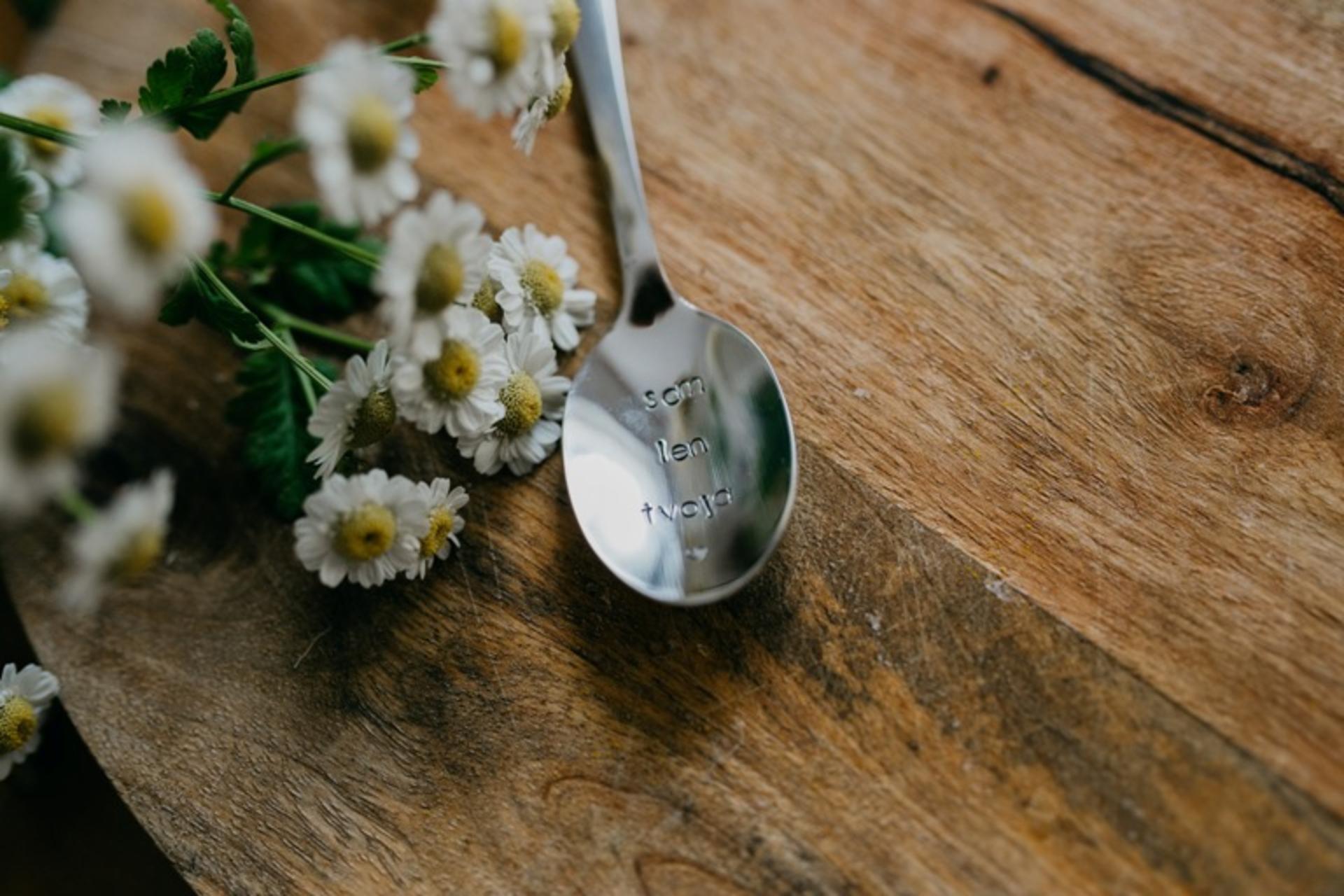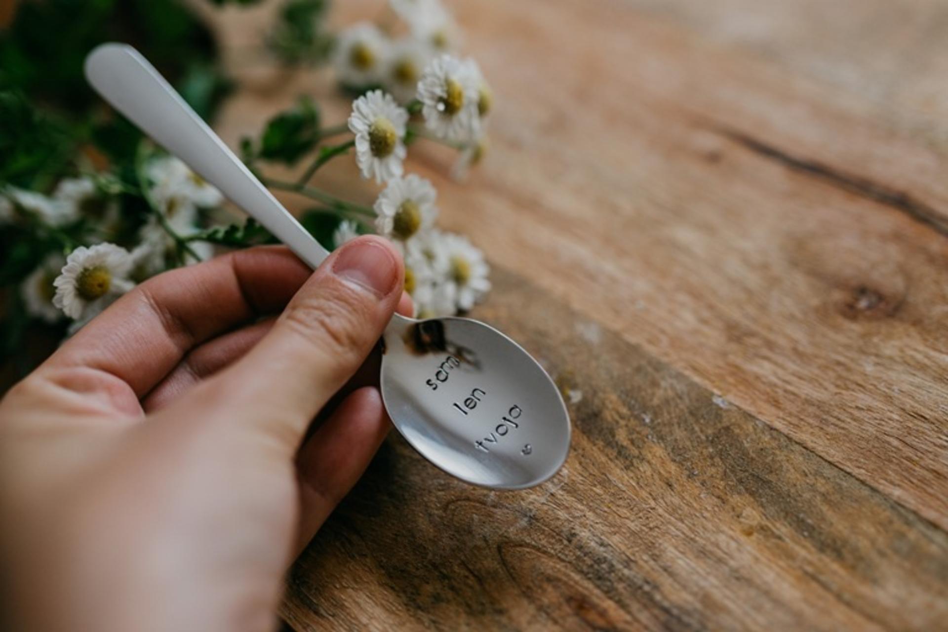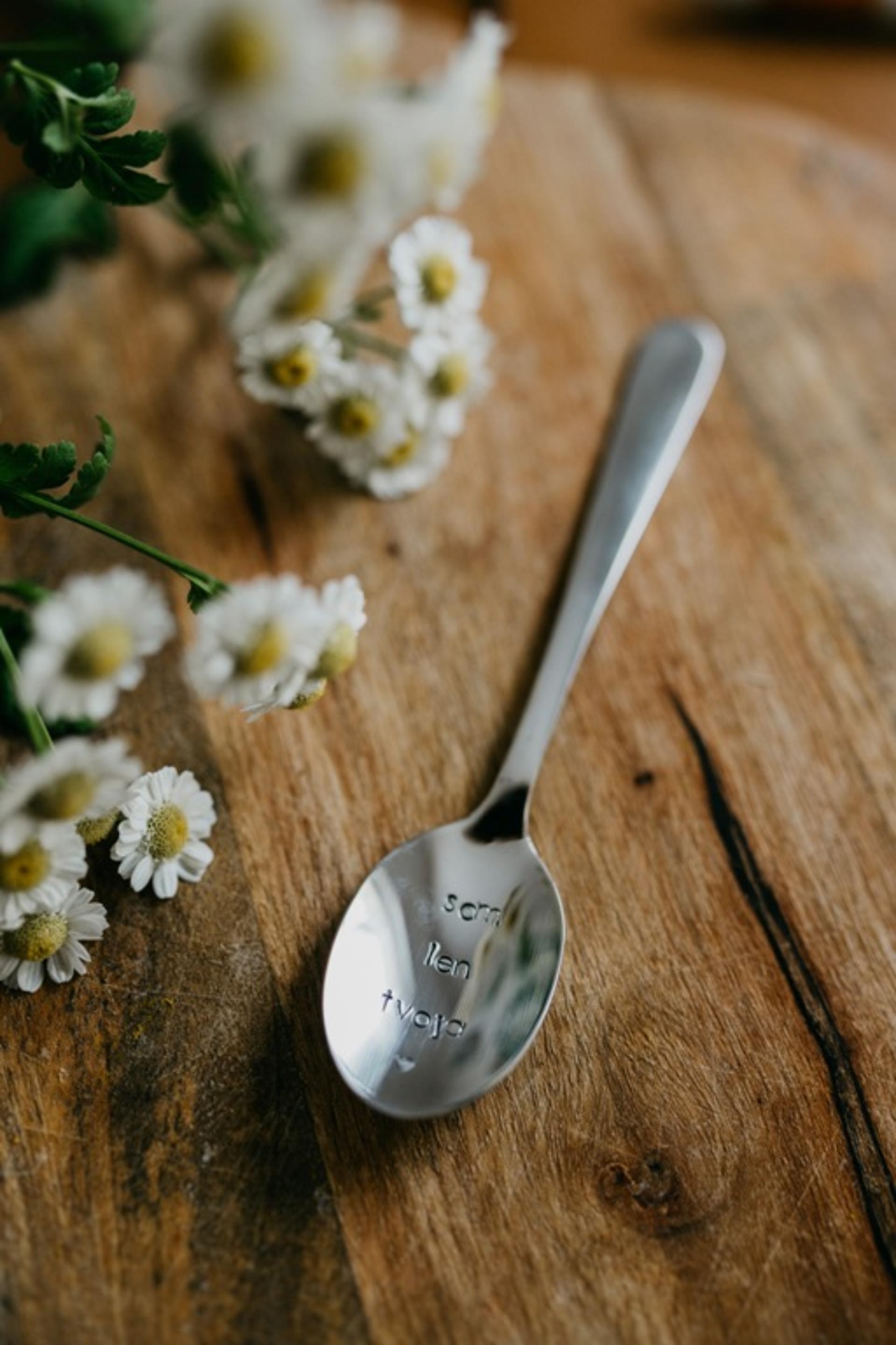 Čajová oceľová lyžička striebornej farby s ručne razeným textom v dolnej naberacej časti lyžičky: "som len Tvoja" doplneným o malé vyrazené srdiečko.