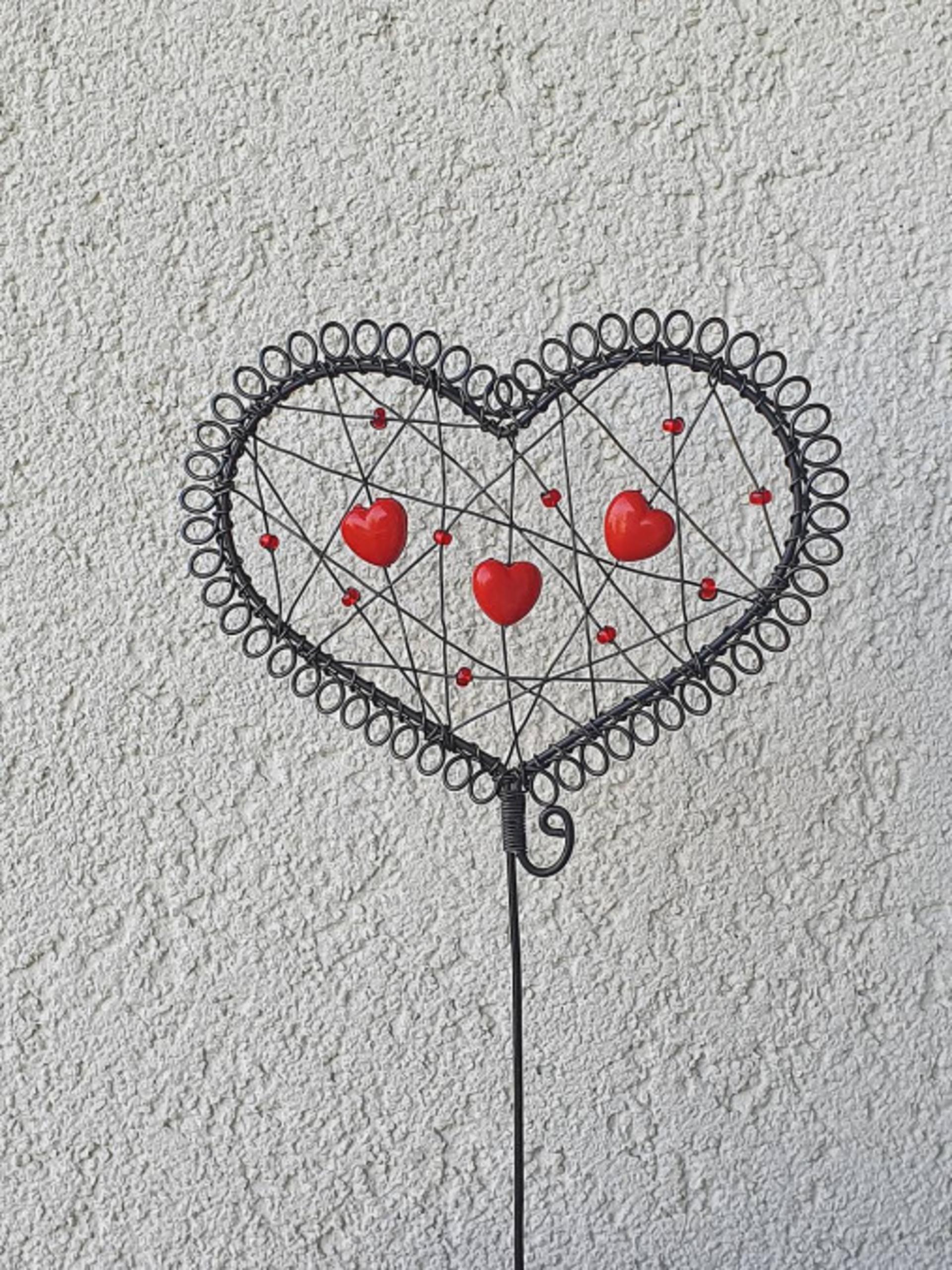 Krásny čierny zápich do kvetináča alebo iného aranžmánu z nerezového žihaného drôtiku ozdobený červenými korálkami.