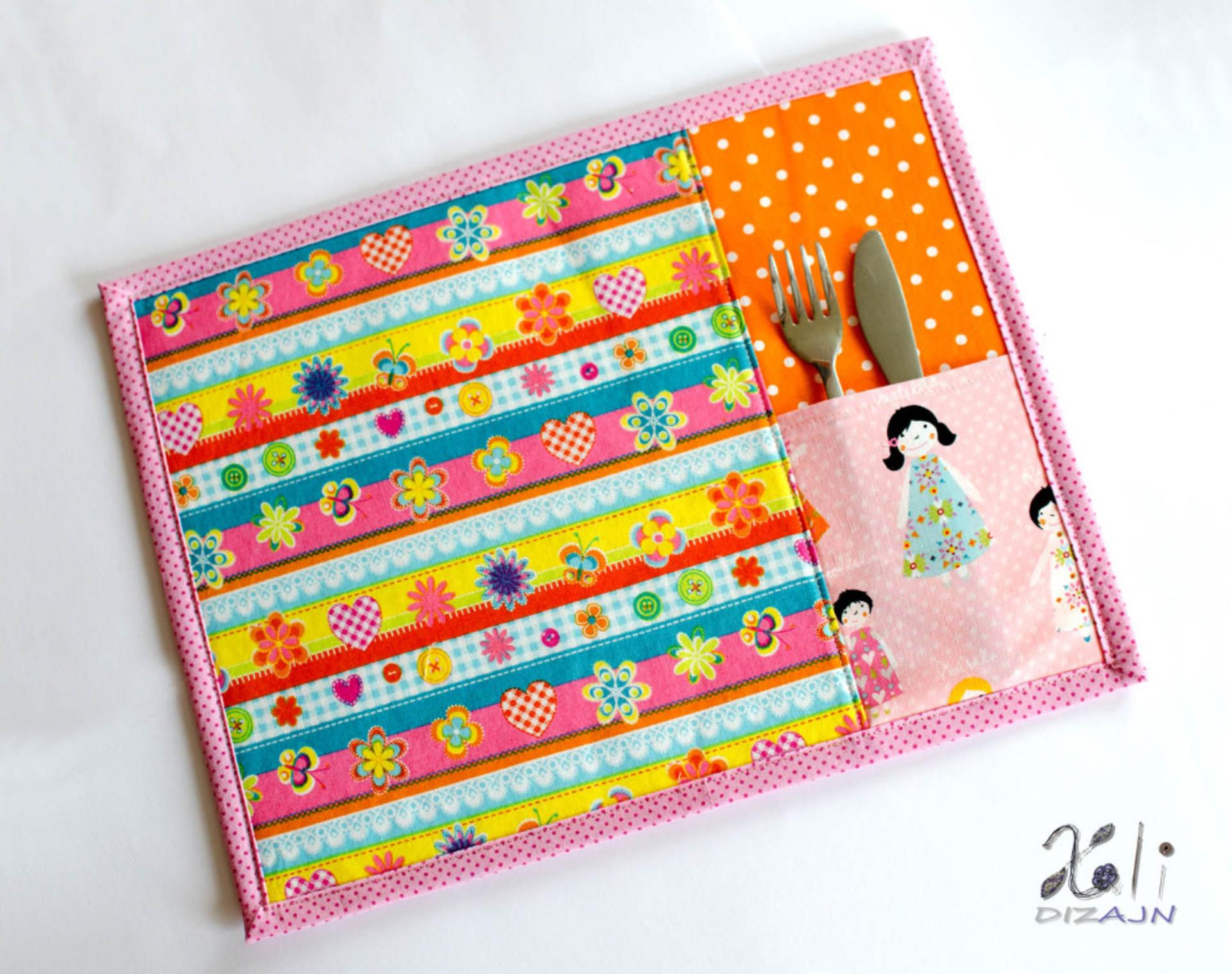 Detské, hravé, veselé a farebné ..... s vrecúškom na detskú lyžičku či príbor.