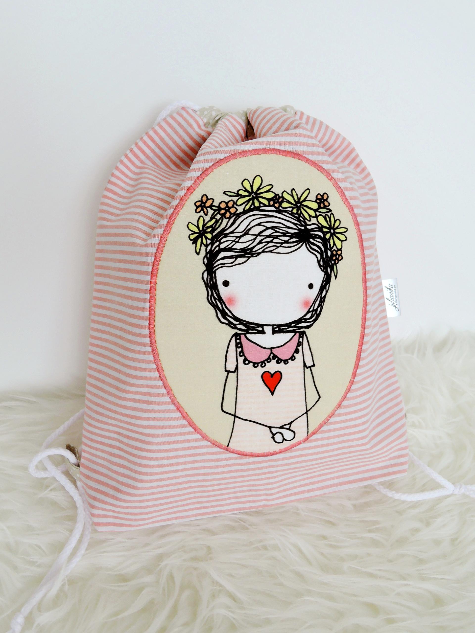 Batôžtek je podšitý + má malé vrecúško vo vnútri. Zaťahuje sa na šnúrky, ktoré sú zároveň aj popruhmi/uškami na plecia (veľkosť sa dá nastaviť posunutím uzlíka). Obrázok je autorský (maľba na textil - fixované žehlením.) Dno batôžka je rozšírené :) Je možné ho prať na 30°C v práčke v ochrannom vrecku (pred praním otočiť naruby).