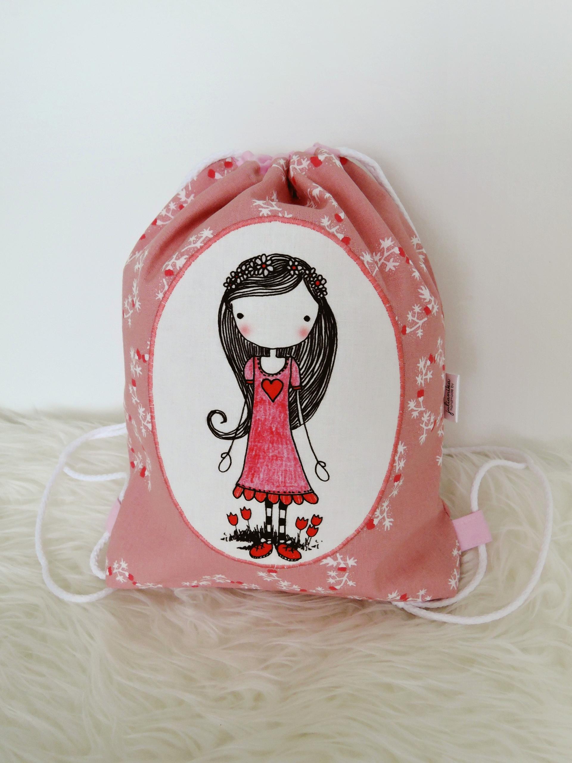 Batôžtek, ruksak, vrecúško pre dievčatko vhodný napr. do škôlky/školy, alebo na výlet, či len tak na hranie Batôžtek je podšitý + má malé vrecúško vo vnútri. Zaťahuje sa na šnúrky, ktoré sú zároveň aj popruhmi/uškami na plecia (veľkosť sa dá nastaviť posunutím uzlíka). Obrázok je autorský (maľba na textil - fixované žehlením.) Dno batôžka je rozšírené :) Je možné ho prať na 30°C v práčke v ochrannom vrecku (pred praním otočiť naruby).