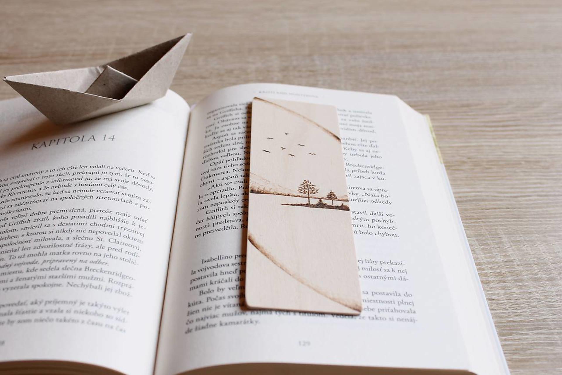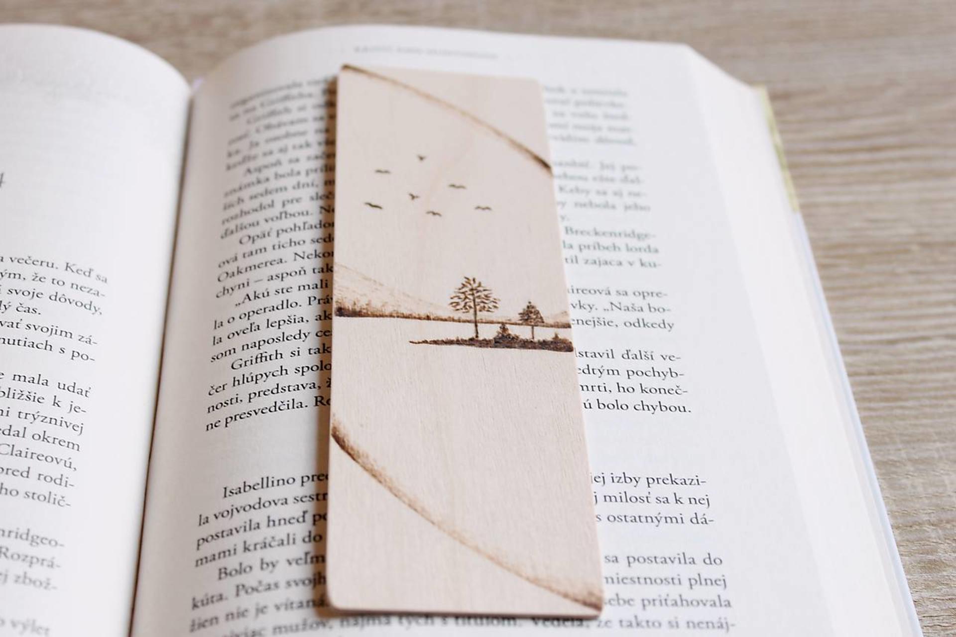 Drevená záložka vyrobená z brezovej preglejky dekorovaná ručným vypaľovaním.
