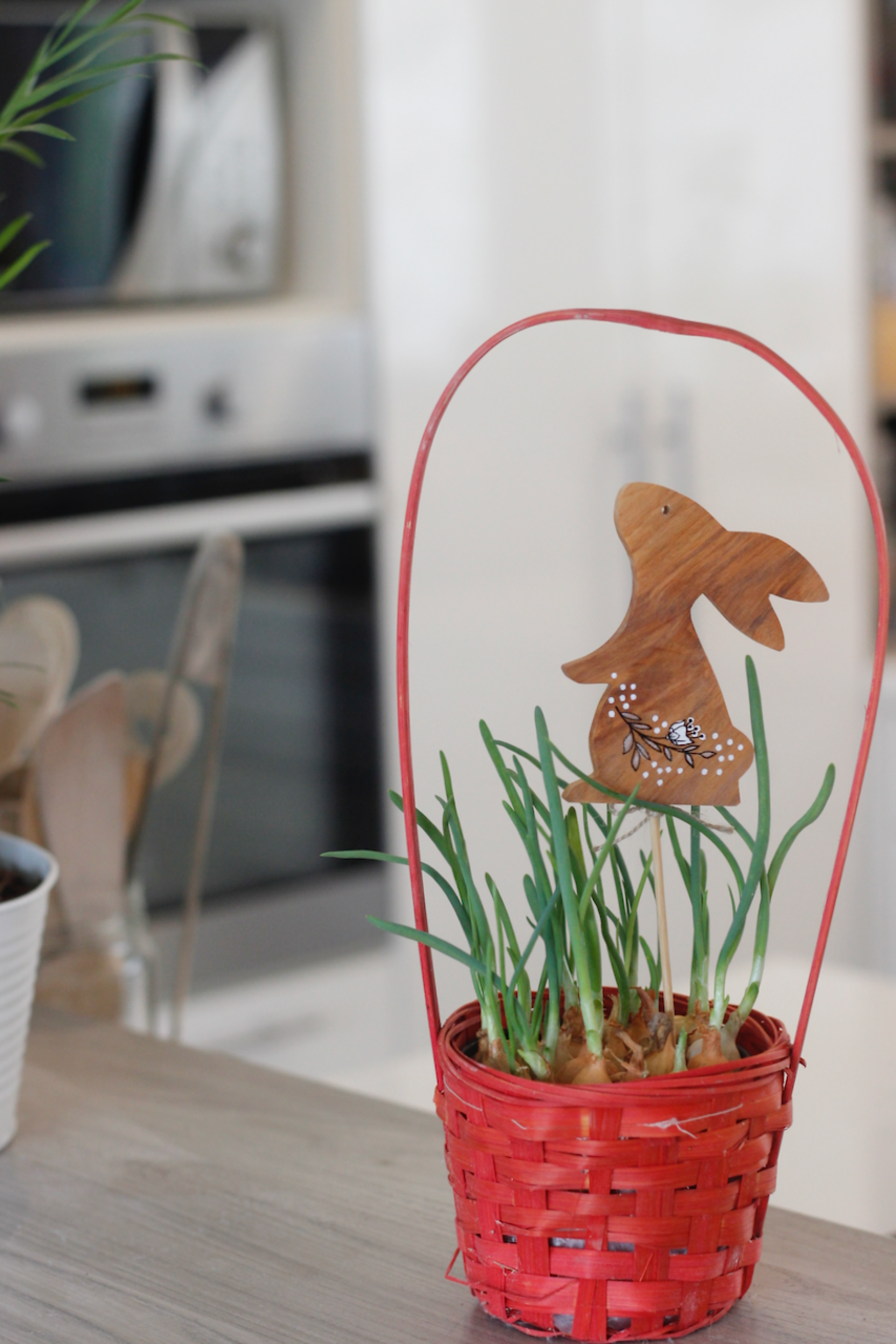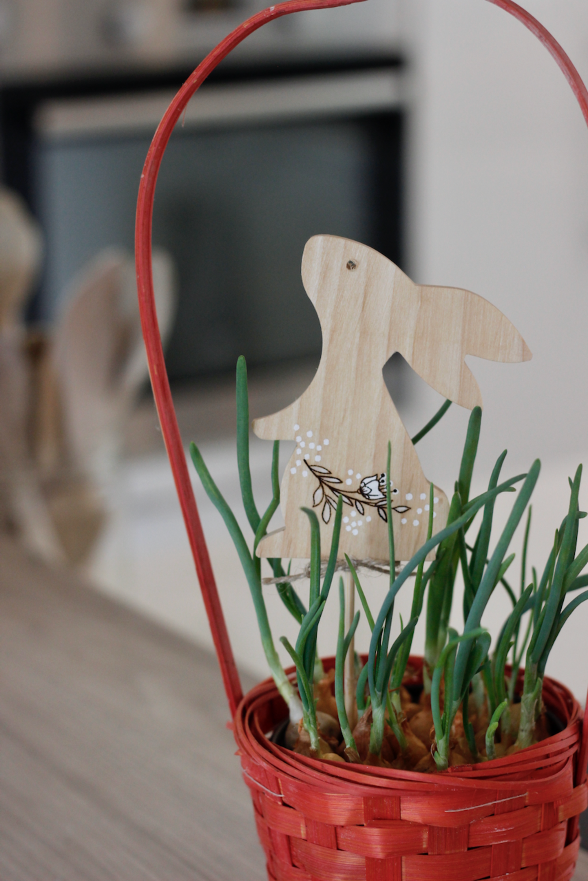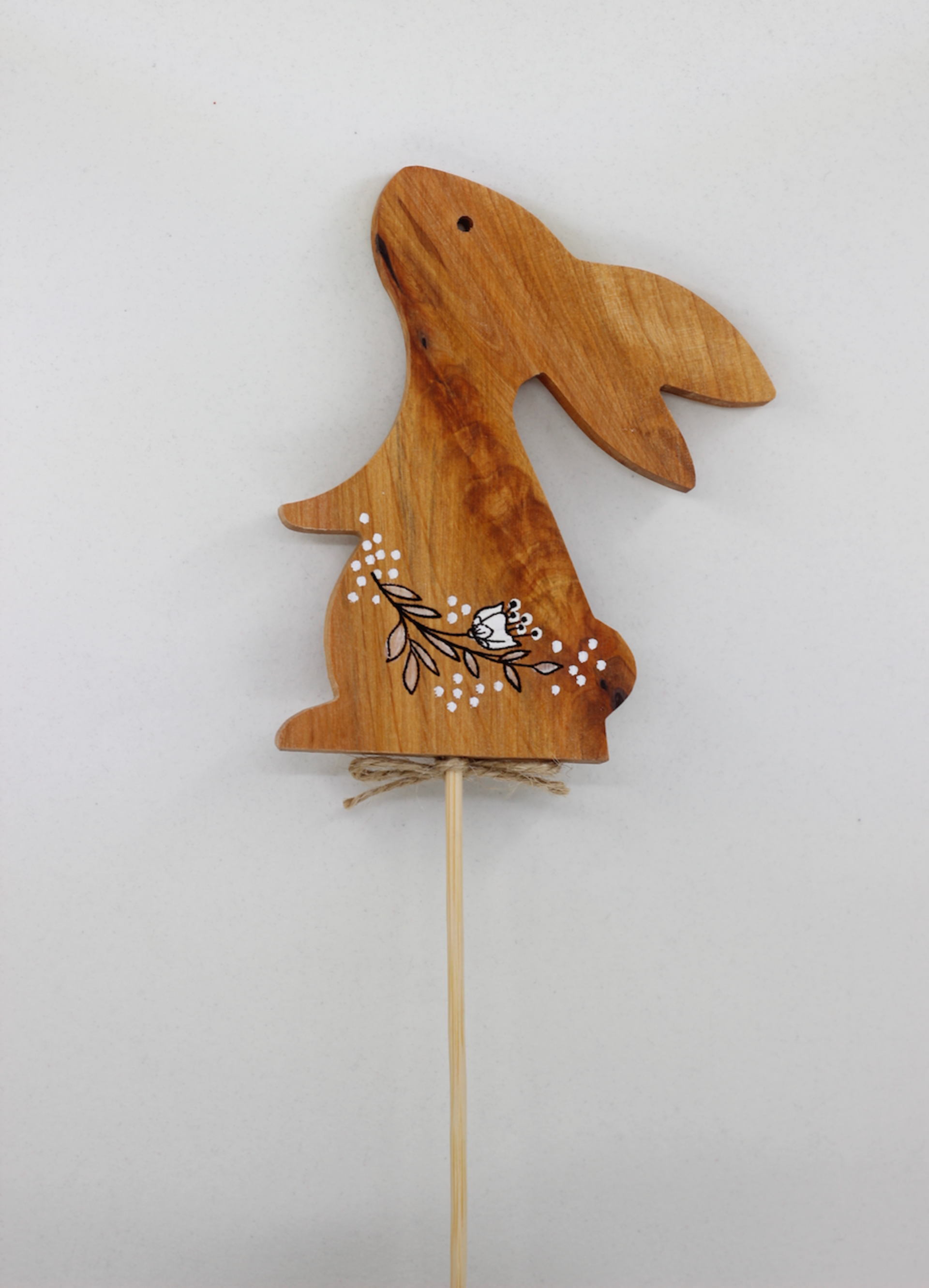 Krásny drevný zápich do kvetináča či do vázy vyrezávaný do tvaru zajačika a s vypáleným a namaľovaných kvietkami.