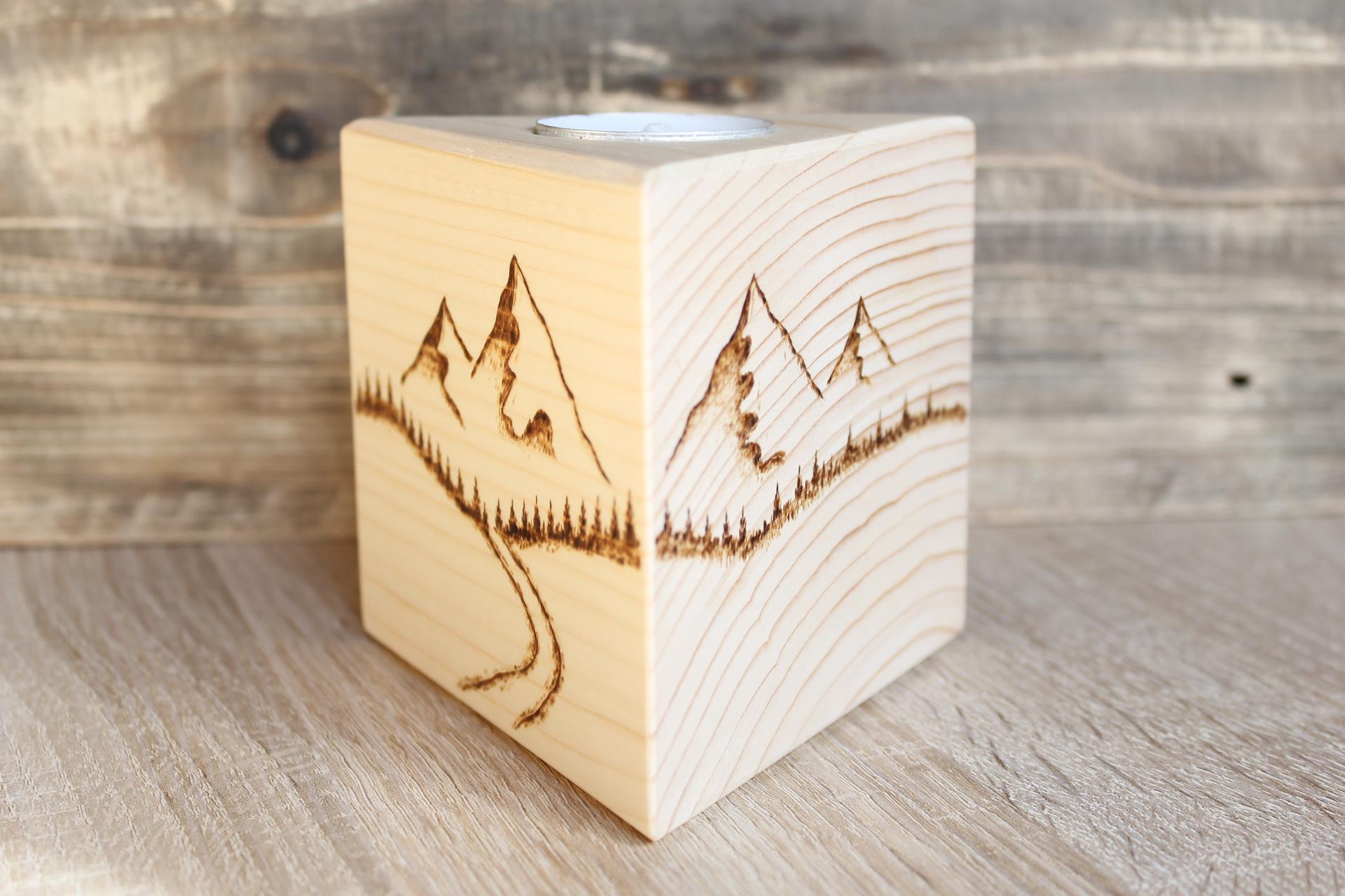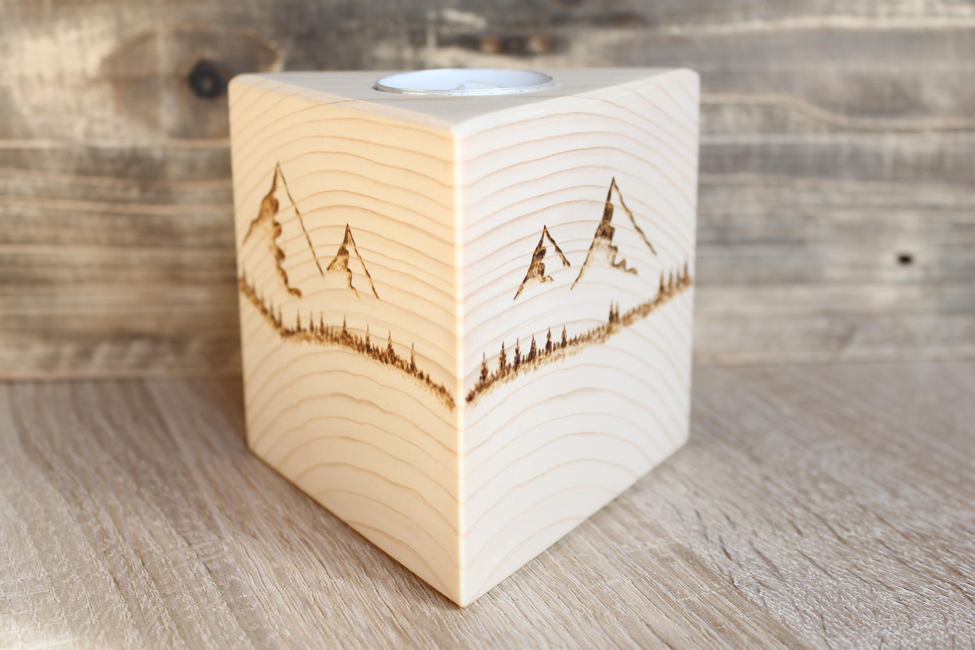 Drevený svietnik vyrobený zo smrekového dreva dekorovaný ručným vypaľovaním. Povrch svietnika je ošetrený olejom na drevo.