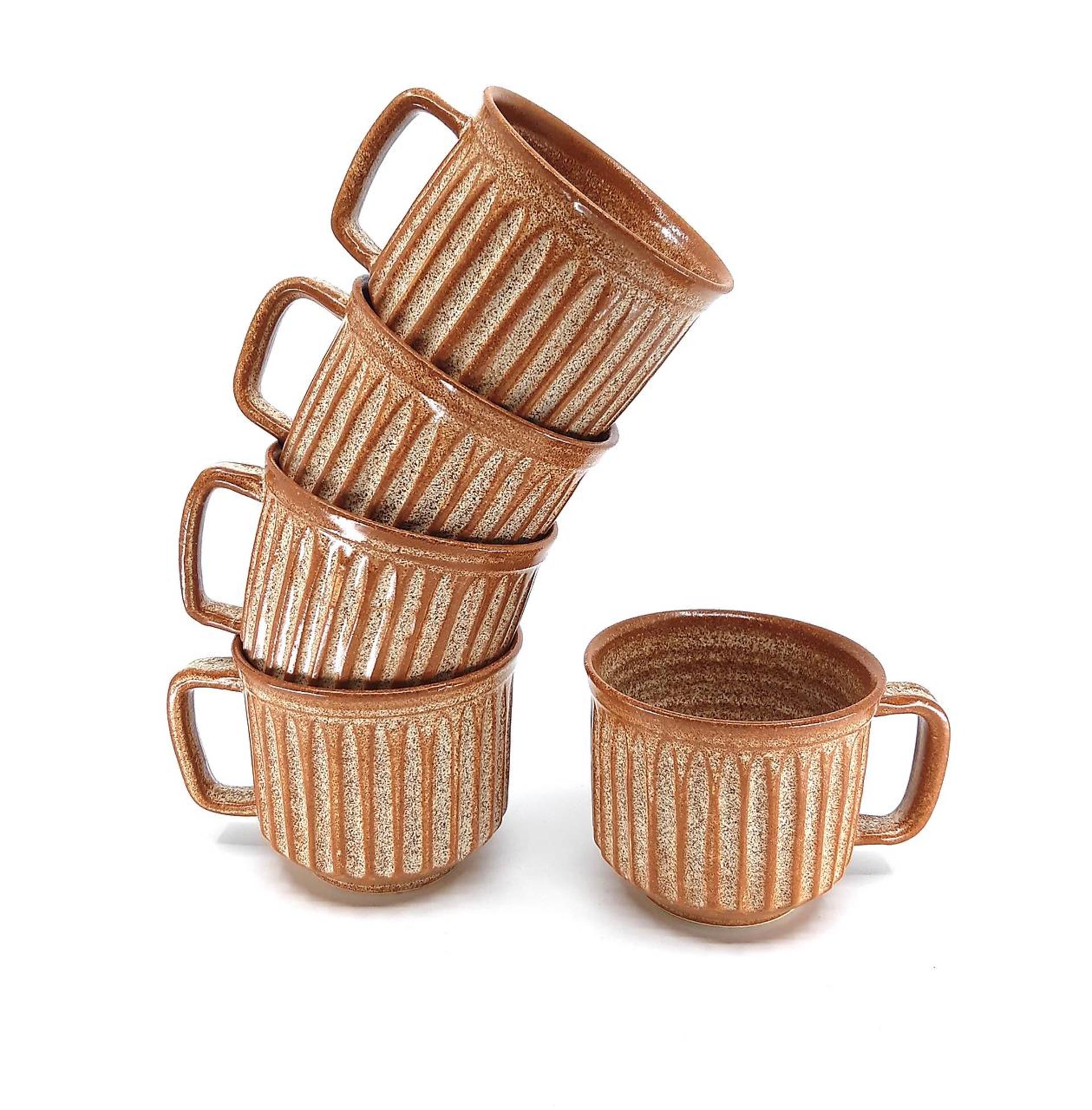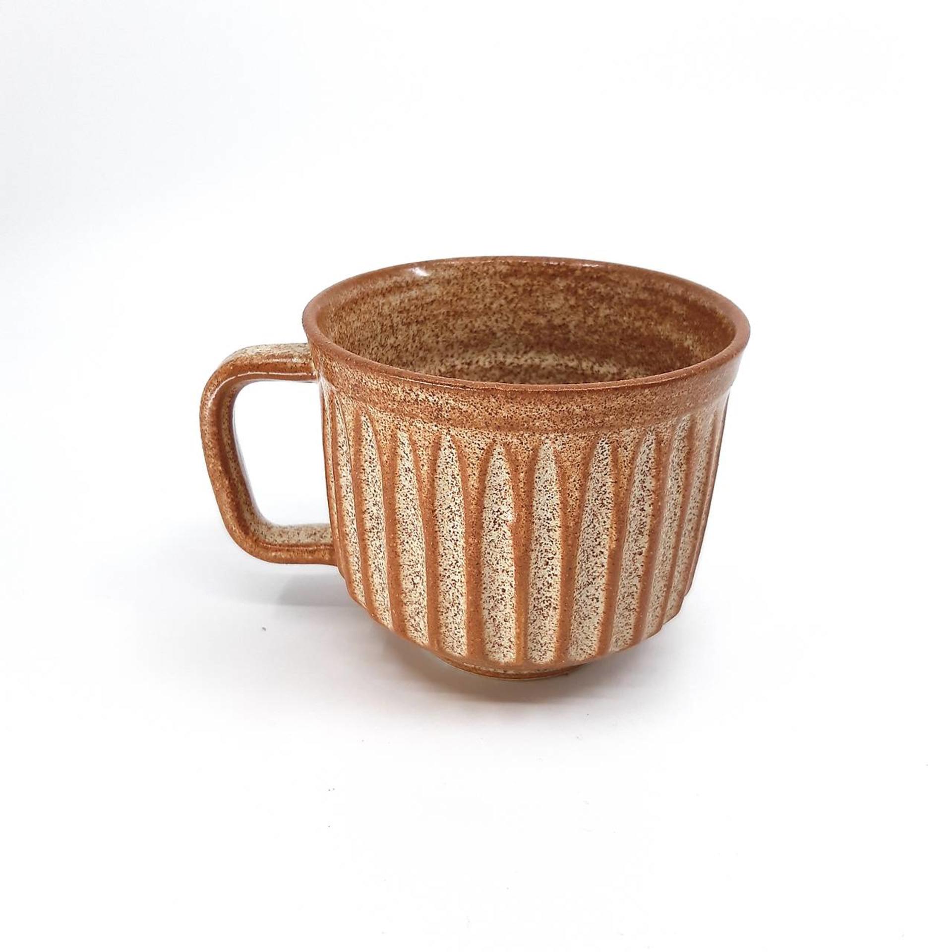 Ručne robené hnedé strakaté kameninové hrnčeky s plastickým reliéfnym dekorom a mierne hranatejším uškom.