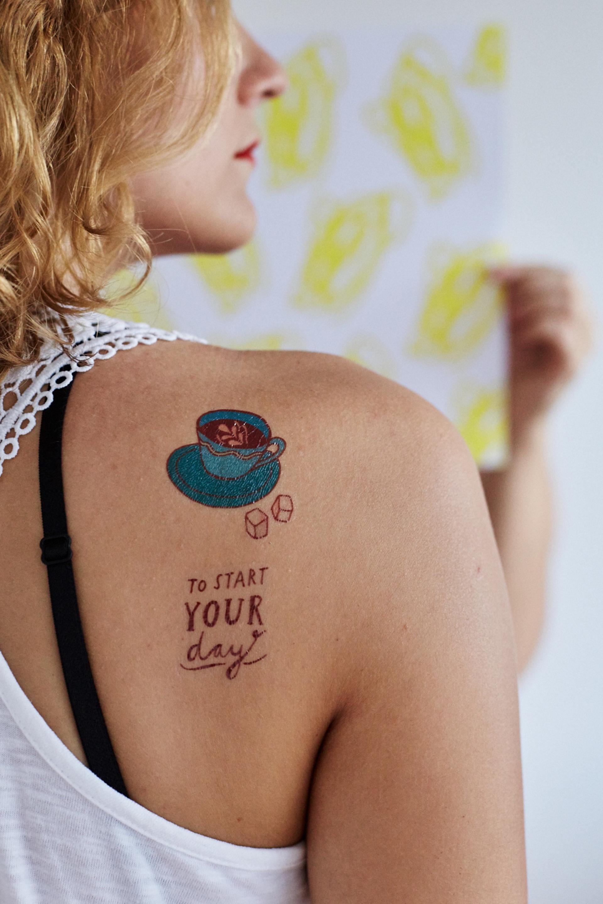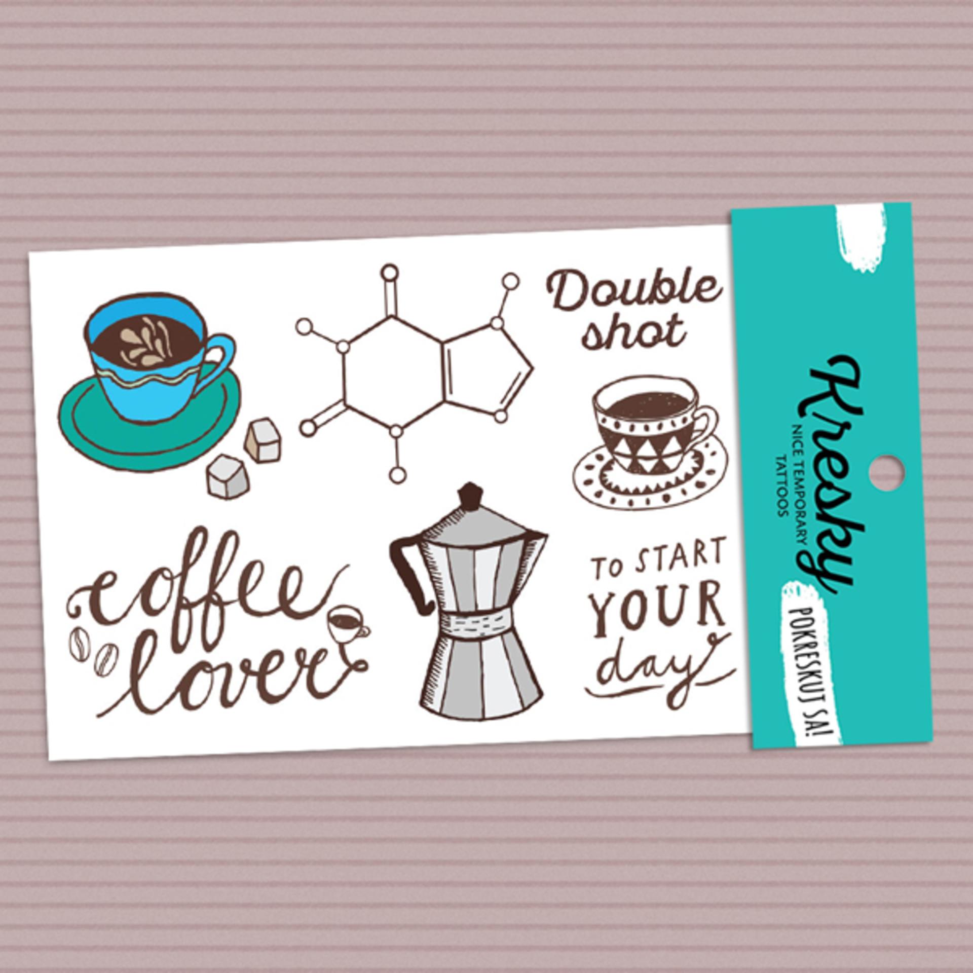 Tak toto je moja káva! Pre všetkých, ktorý prepadli kávovej vôni sme pripravili moka kávovar (koťogo), kávičku, double shot alebo môžete machrovať s molekulou kofeínu. Dočasné tetovačky neaplikujte na citlivú pokožku, v blízkosti očí alebo v prípade alergie. Dermatologicky testované a bezpečné pre deti. Veľkosť: arch veľkosti 10 x 15 cm Materiál: potlačený papier Spôsob výroby: sieťotlač