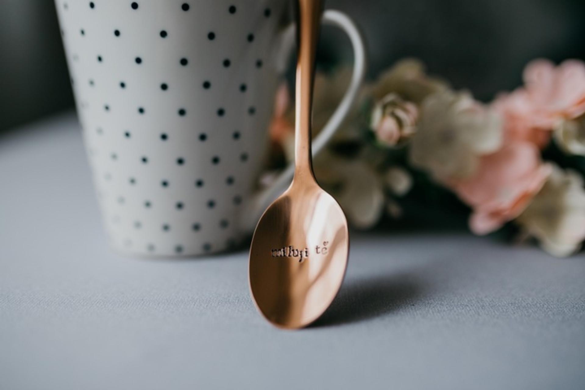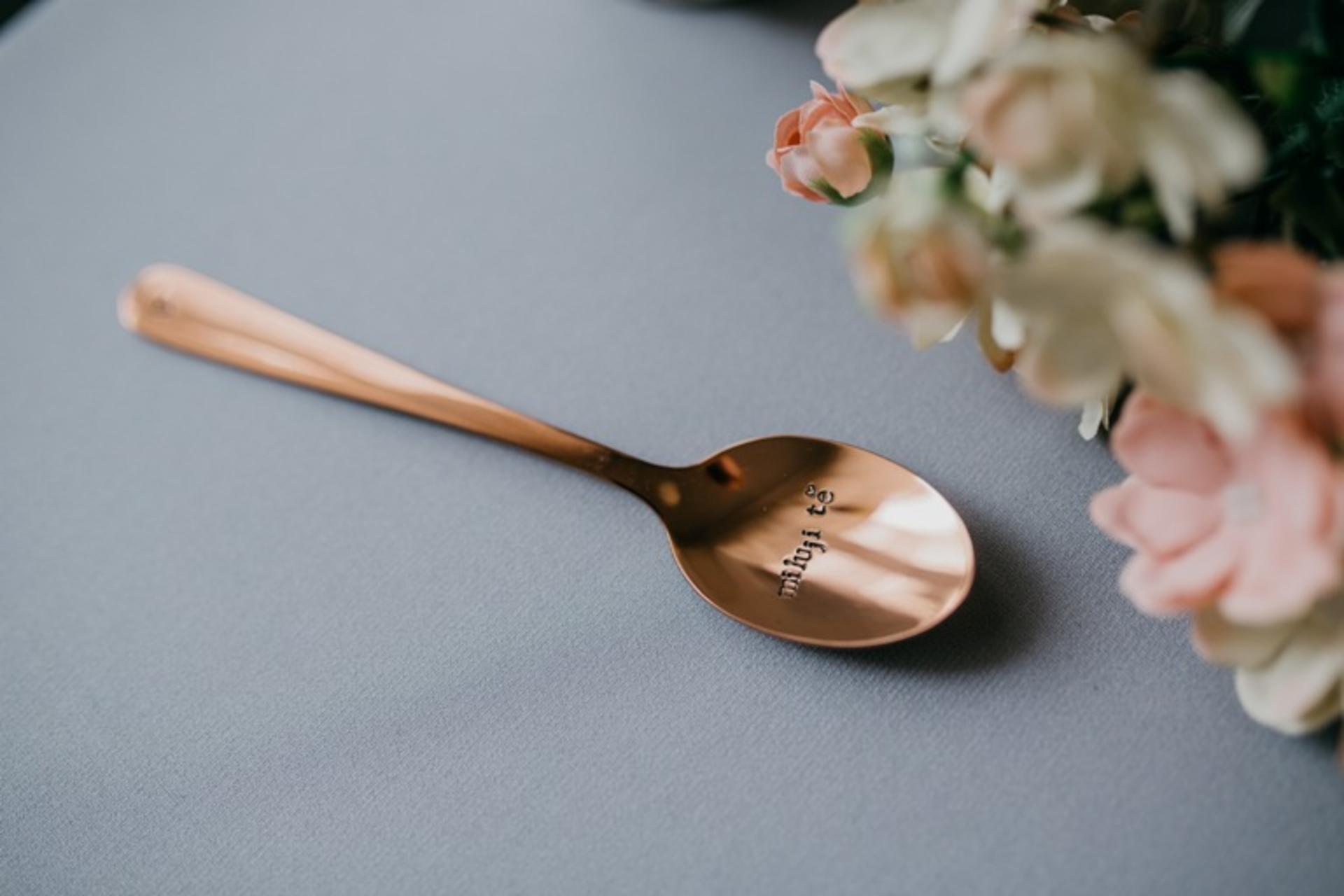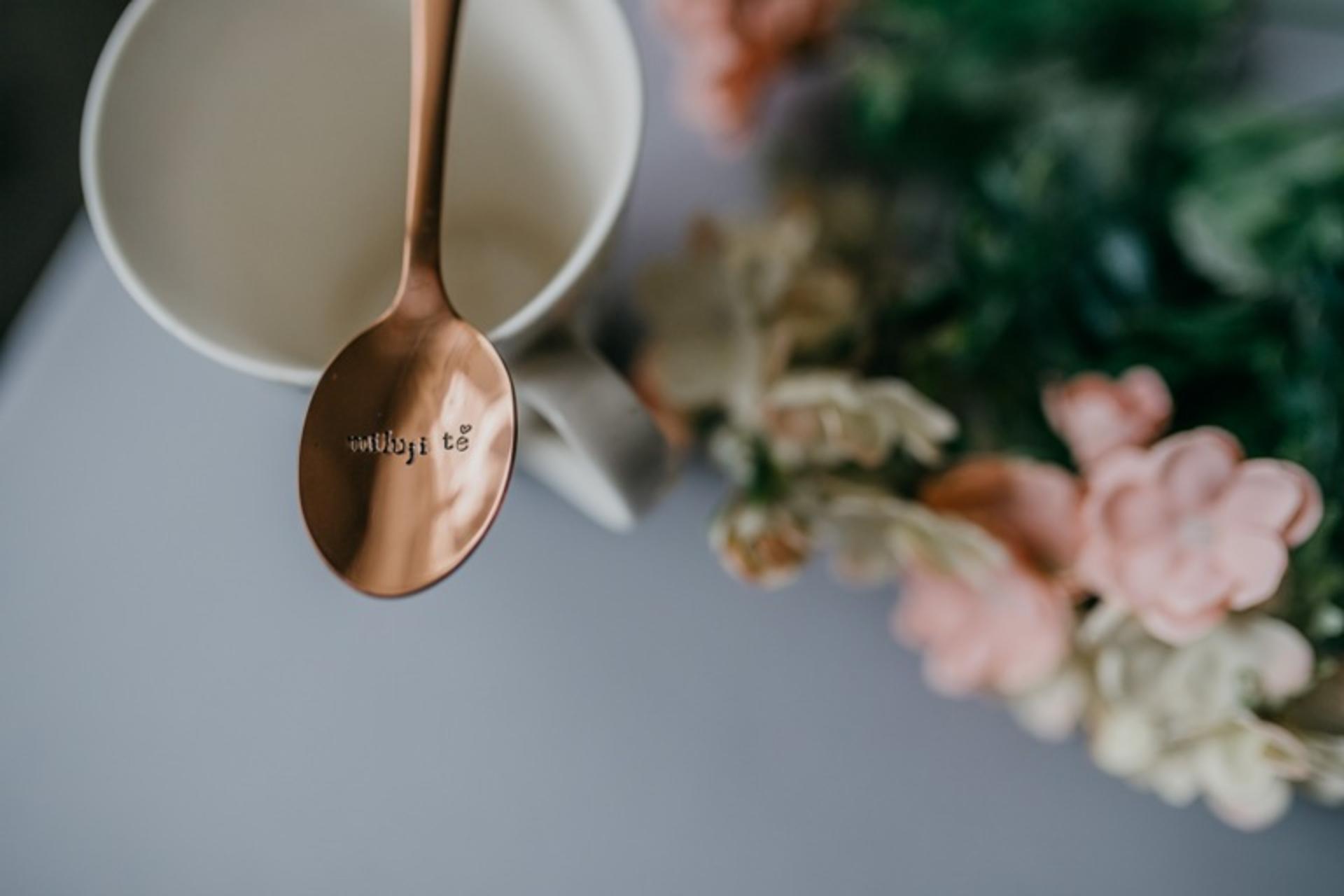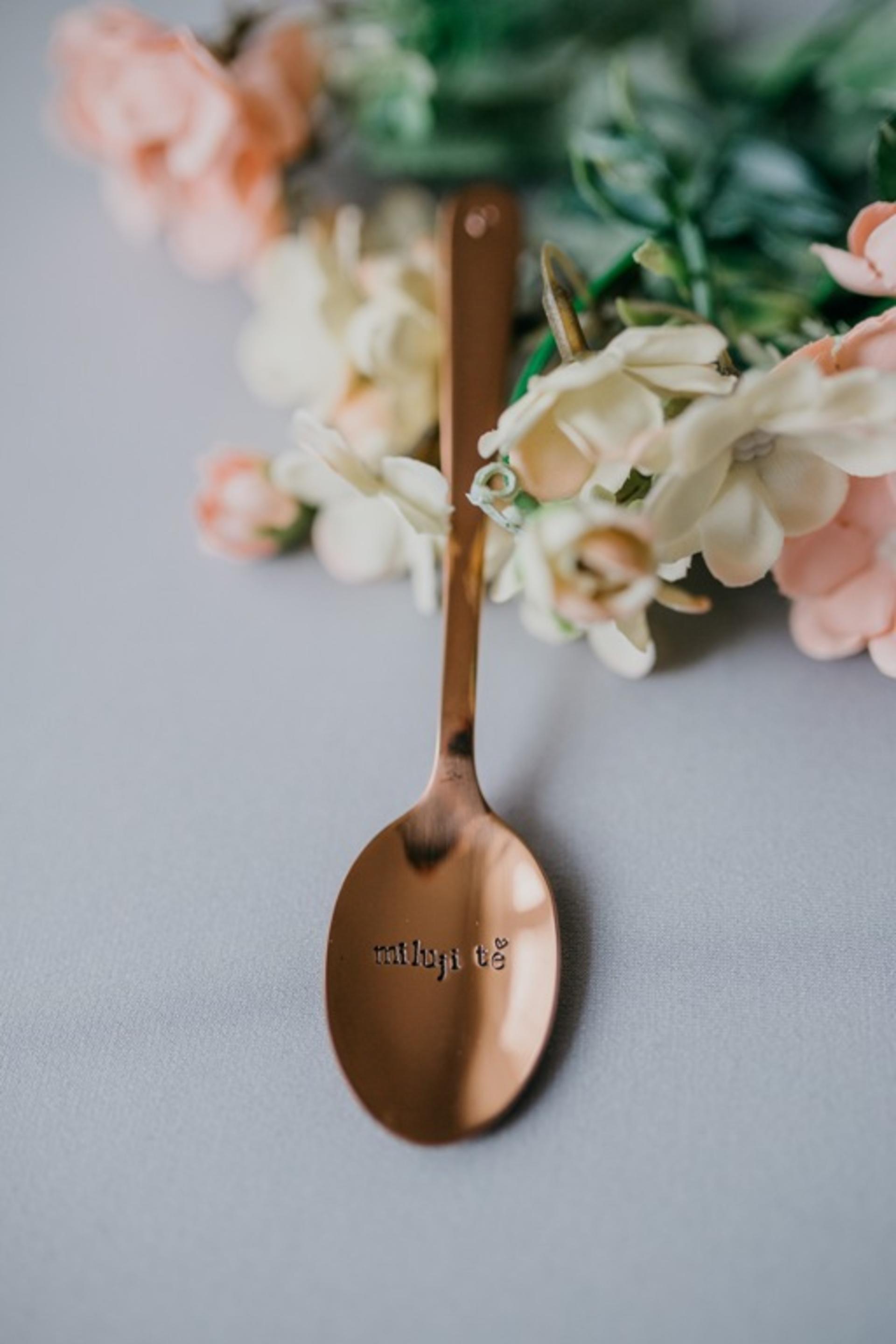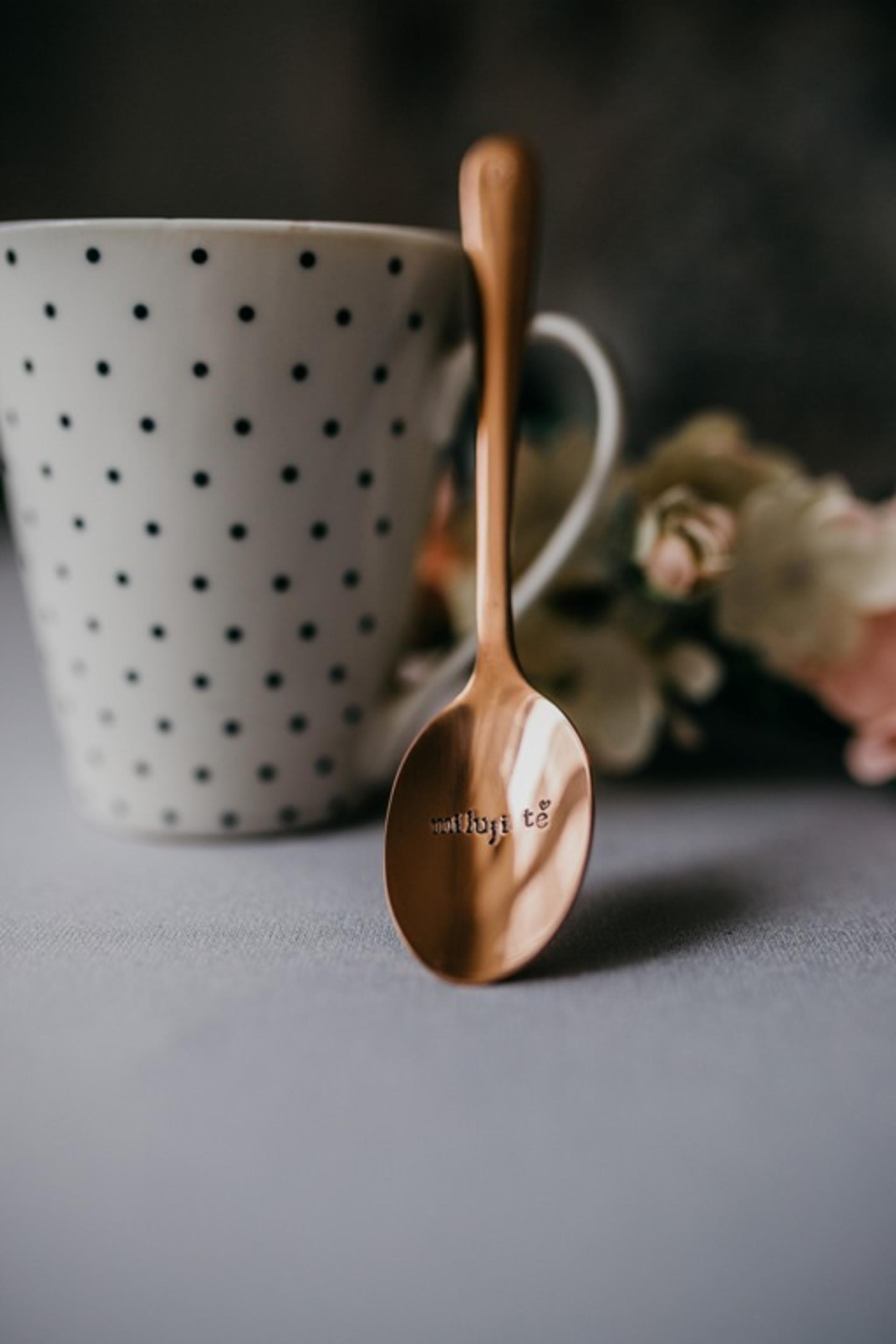 Čajová oceľová lyžička medenej farby s ručne razeným textom v dolnej naberacej časti lyžičky: "miluji te" doplnená mäkčeňom v tvare mini srdiečka a razeného srdiečka na rúčke lyžičky.