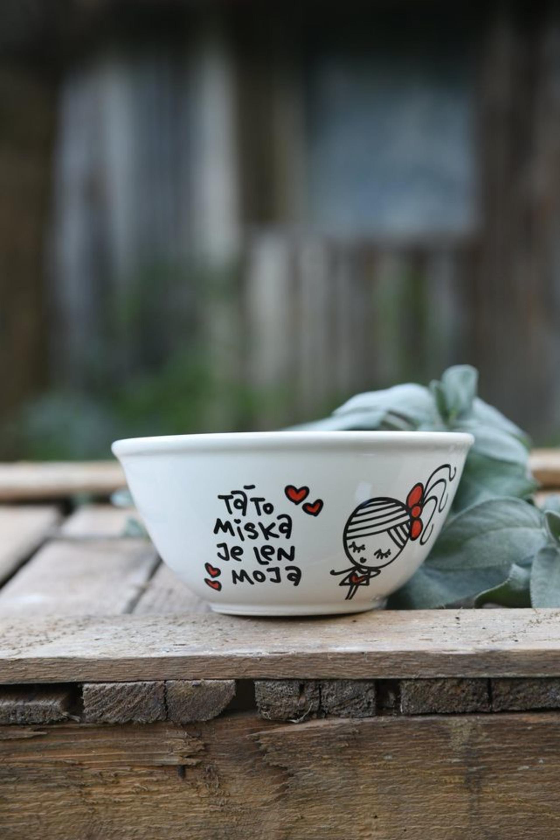 Každá miska je ručne maľovaná, takže motív (najmä počet srdiečok či vlásky a poloha rúk) sa môže mierne líšiť.