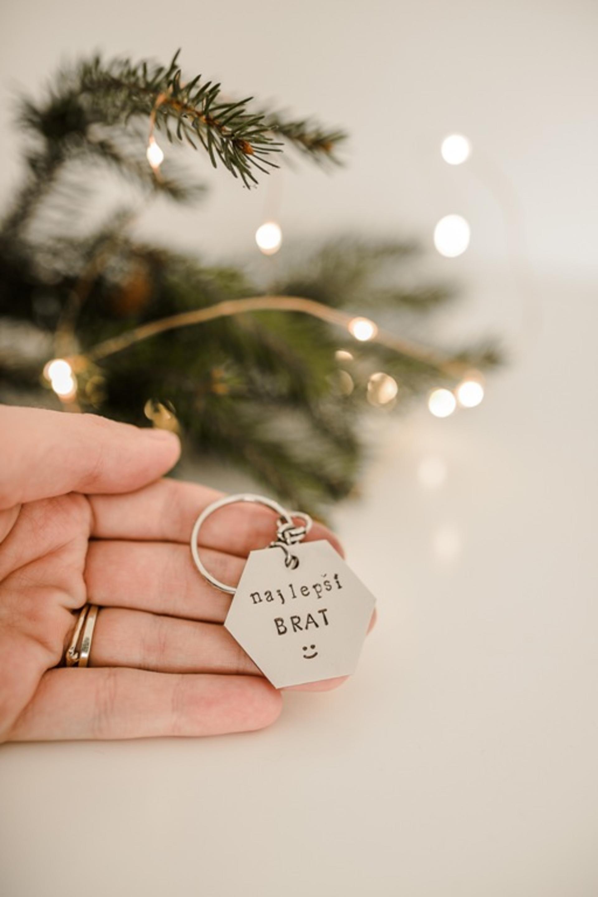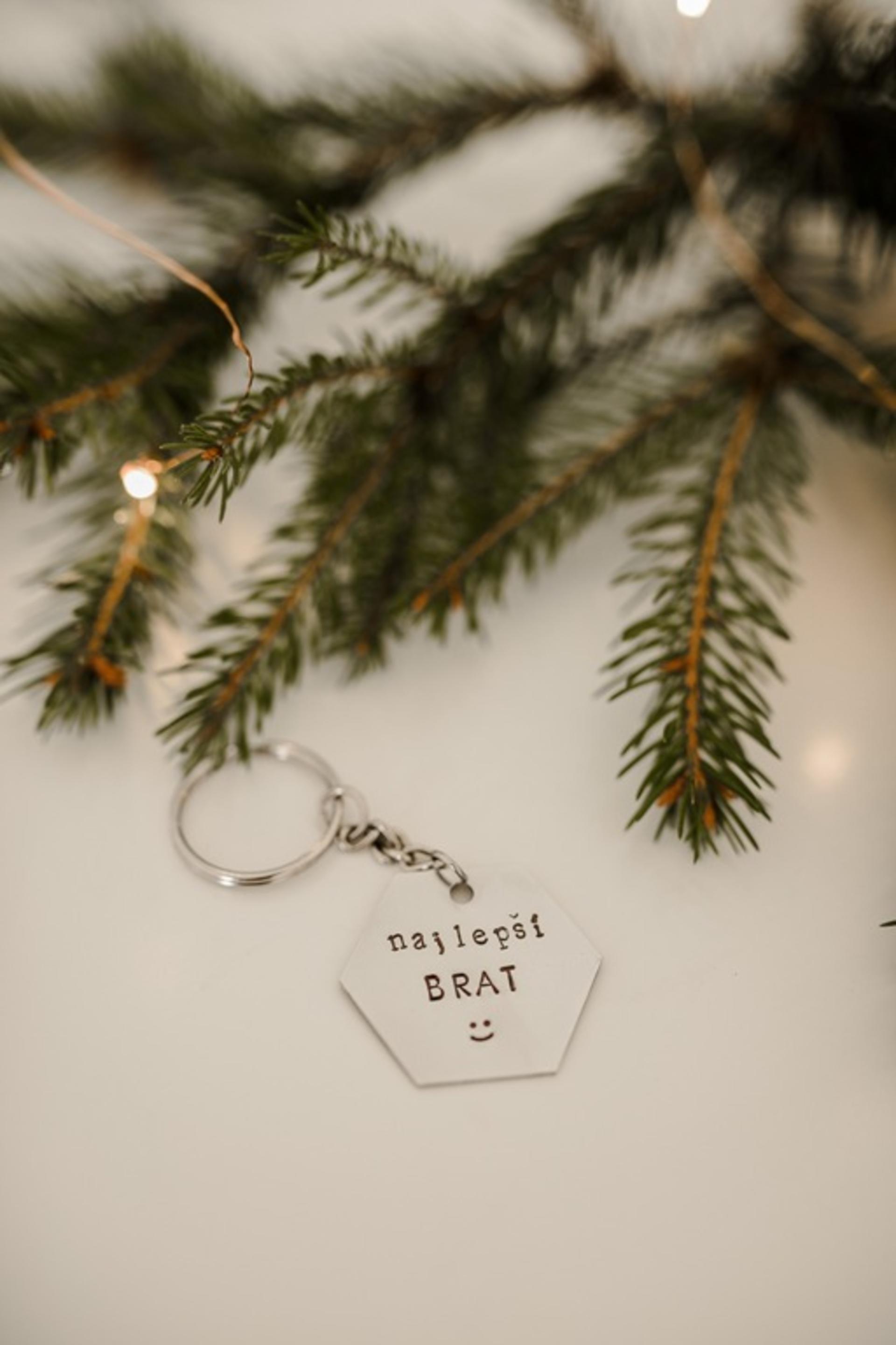 Nerezový prívesok striebornej farby s ručne vyrazeným textom "najlepší BRAT" a usmiatou tváričkou .