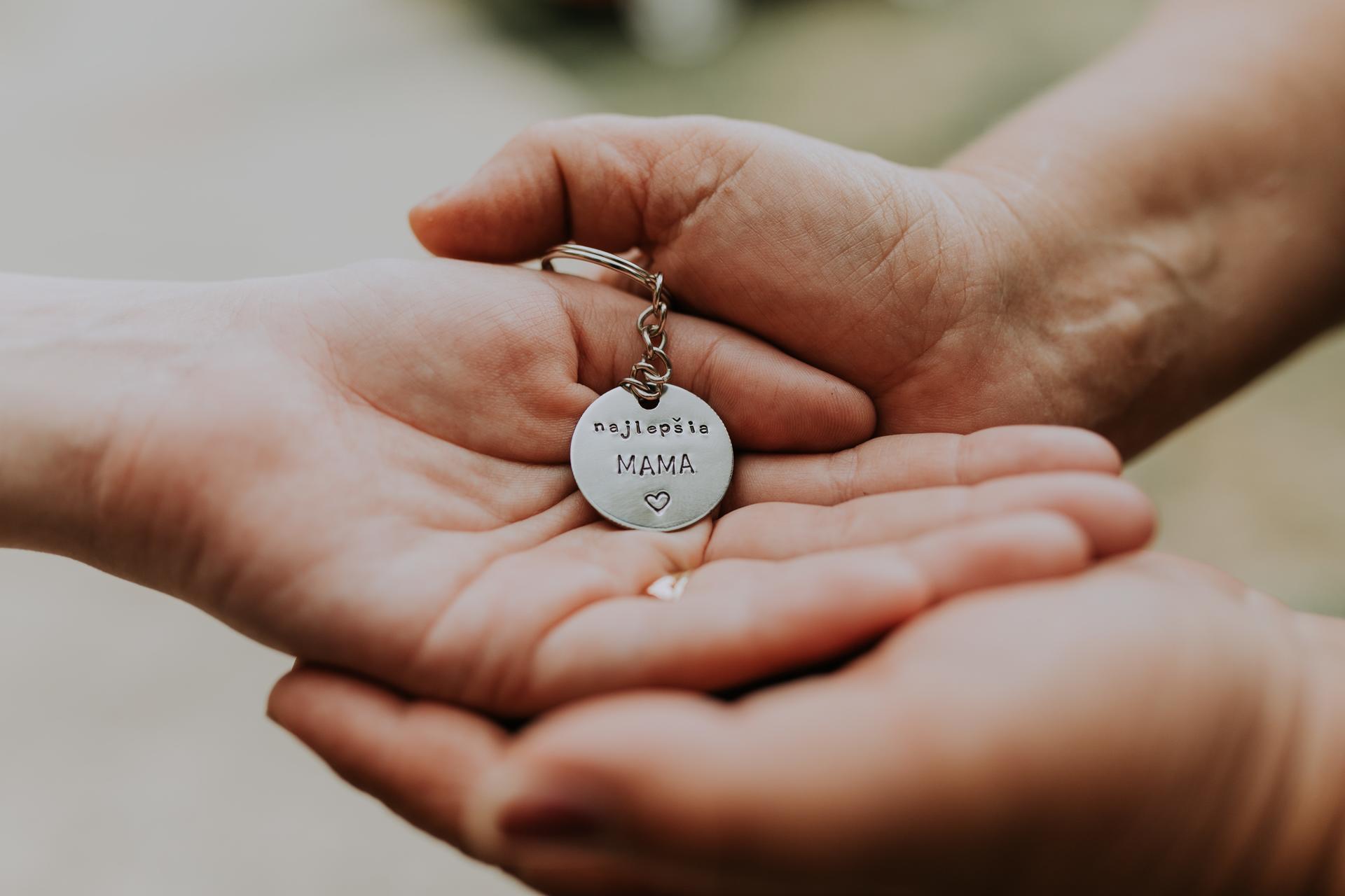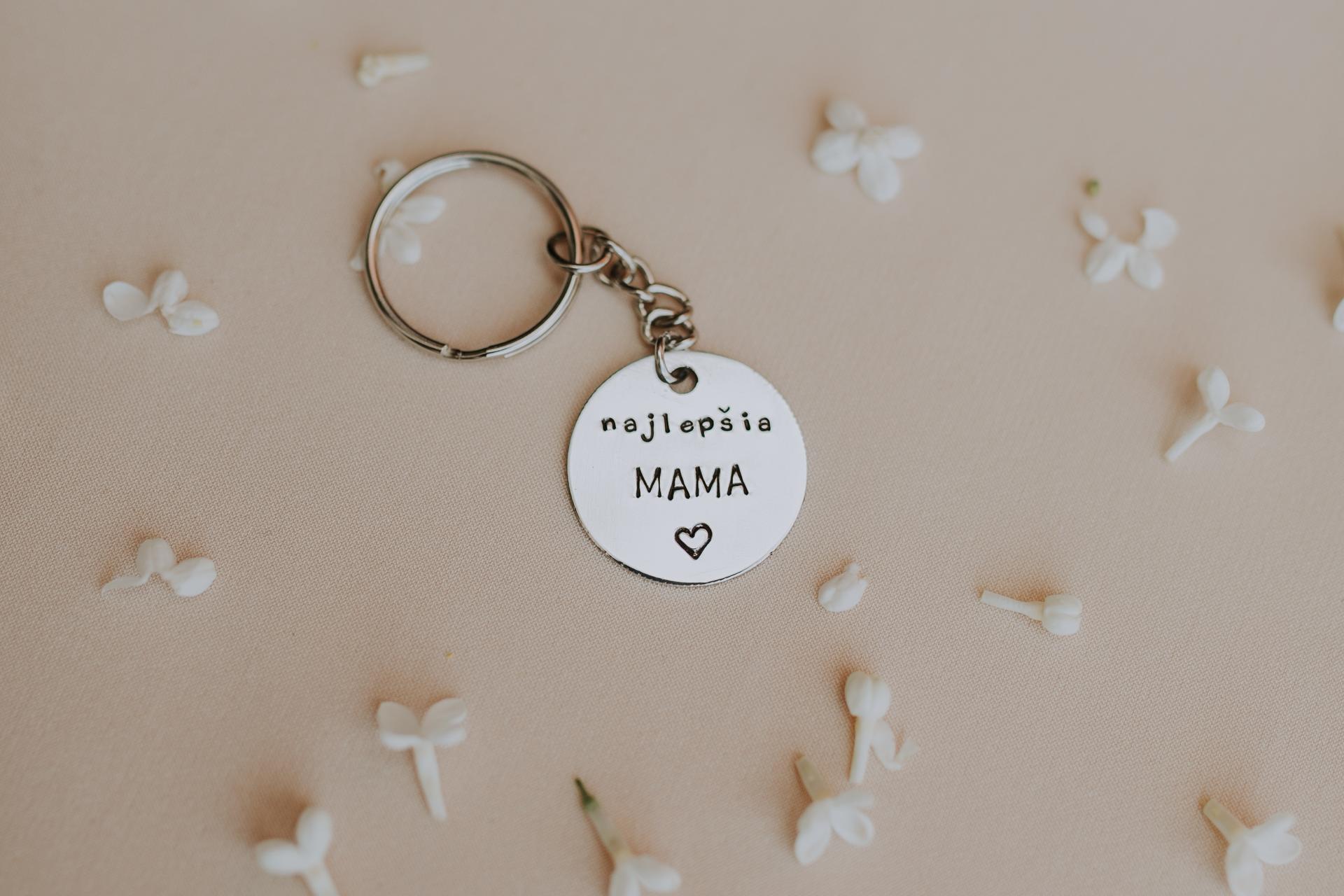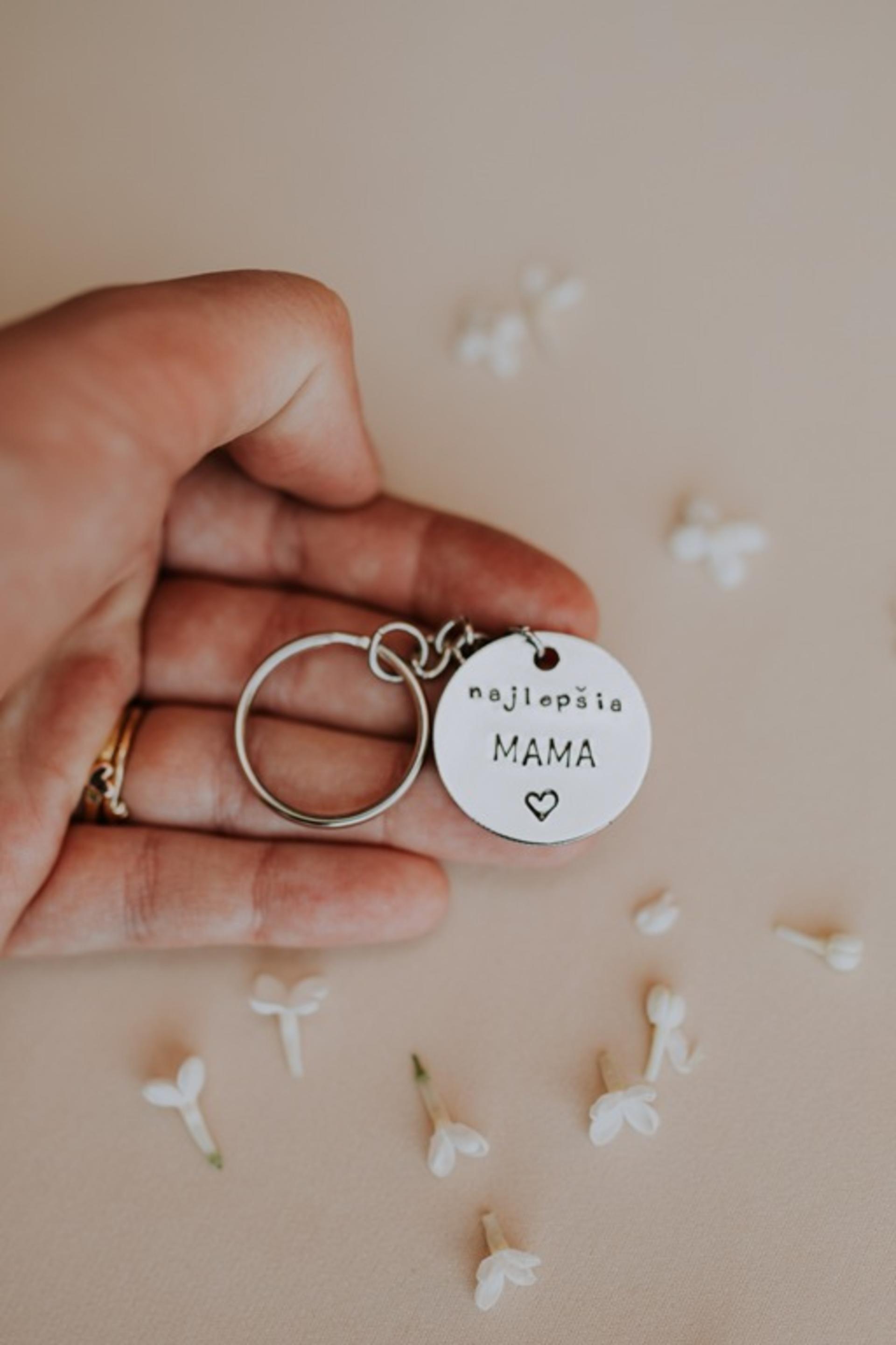 Nerezový prívesok striebornej farby s ručne vyrazeným textom "najlepšia MAMA" a vyrazeným srdiečkom.