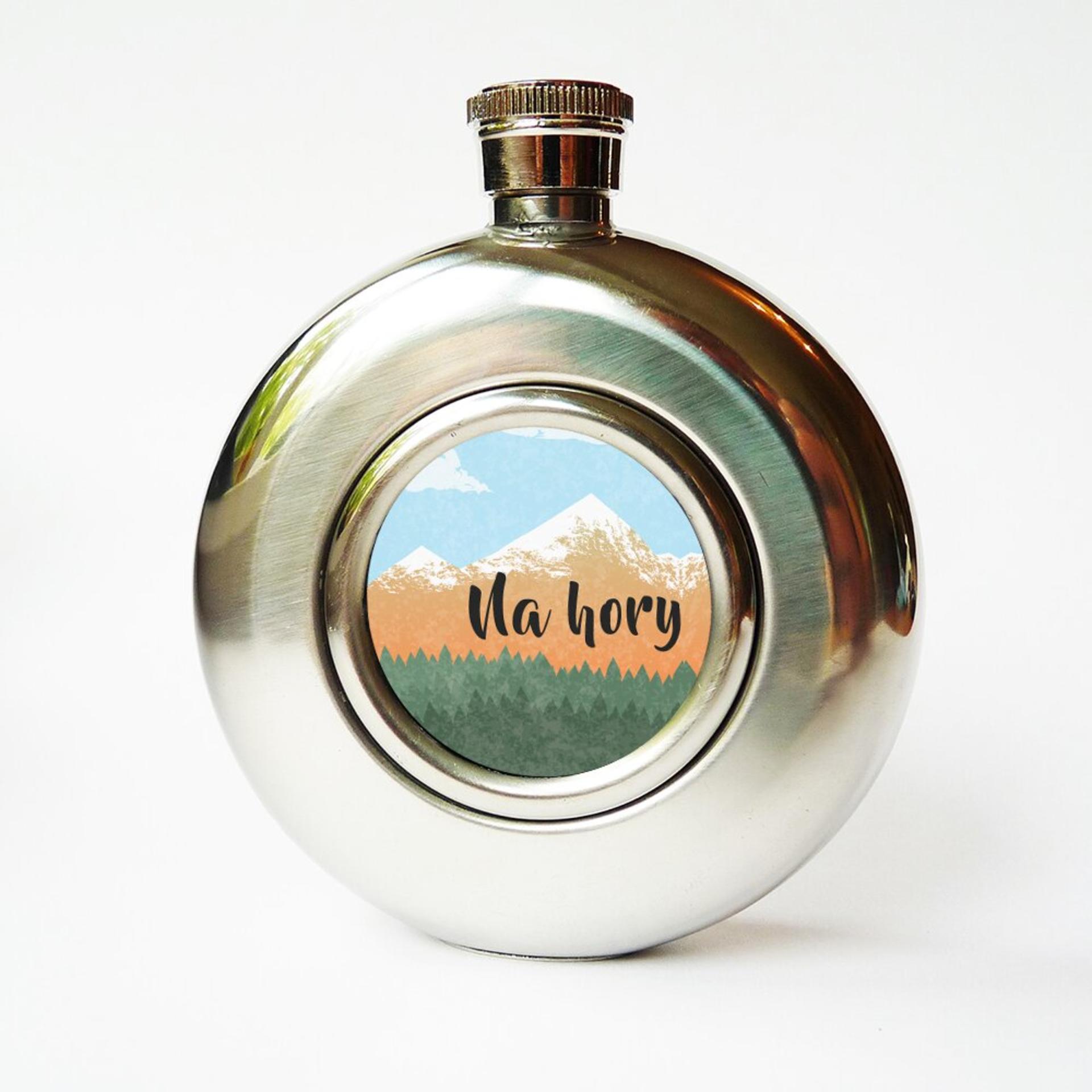 Okrúhla nerezová ploskačka na cesty s obrázkom hôr.