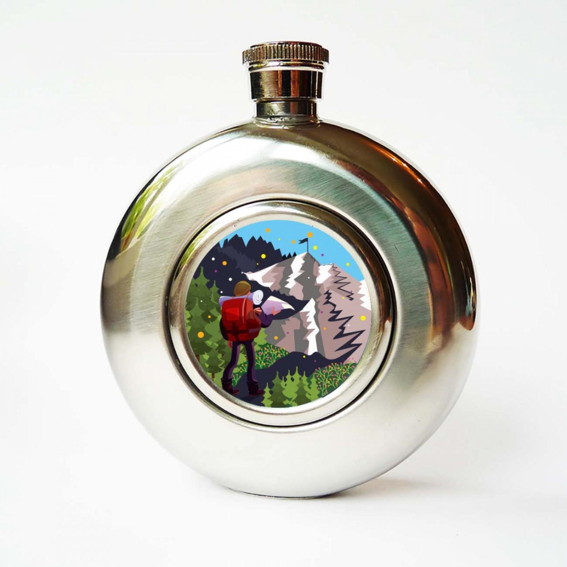 Okrúhla nerezová ploskačka na cesty s obrázkom z turistu s mapou a horami v pozadí.
