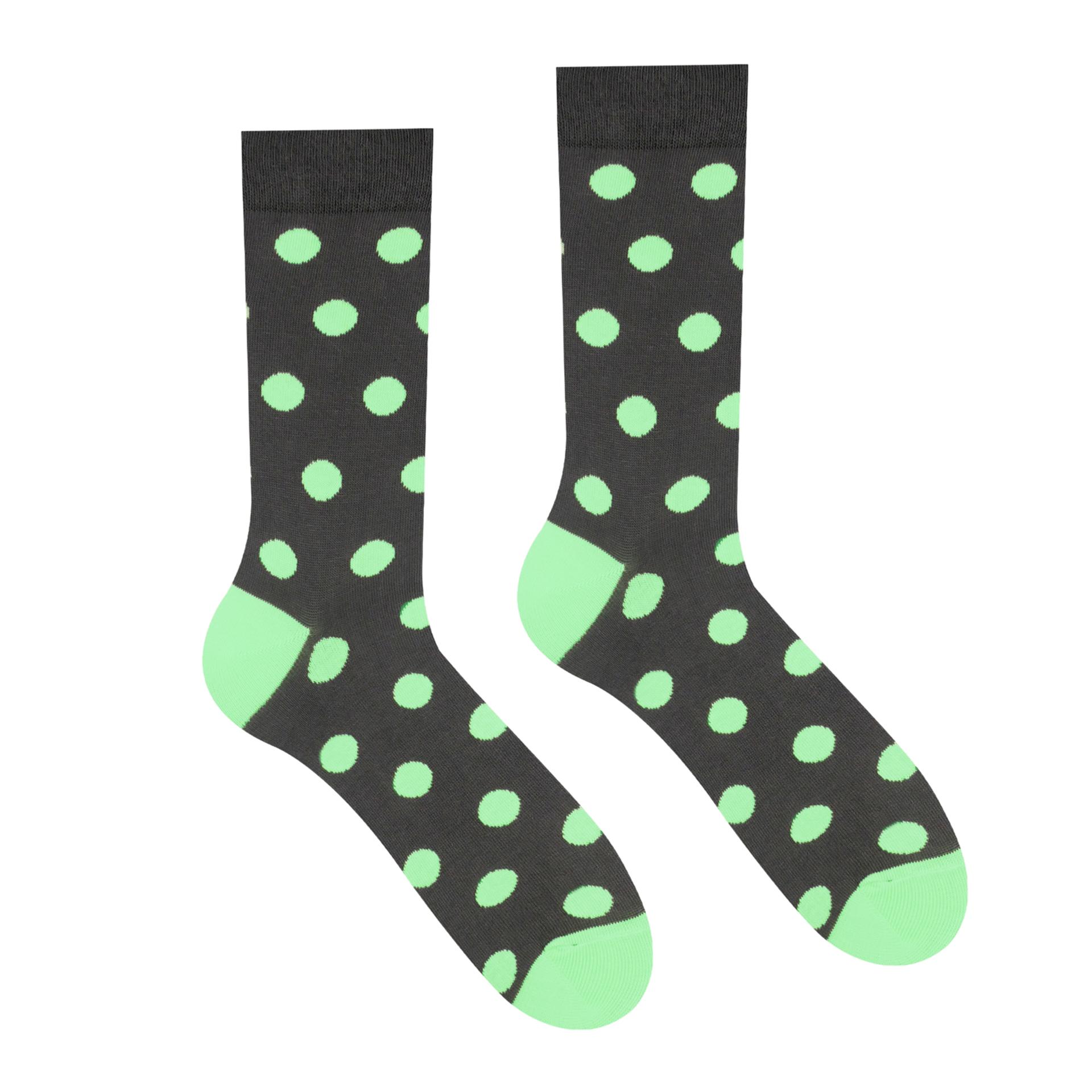 Veselé bodkované ponožky v kombinácii netradičnej sivej a pastelovej zelenej. Veselé vzory aj pre ľudí, ktorí nechcú aby im nohy žiarili veselými farbami, ale predsa – obyčajné ponožky sú out.