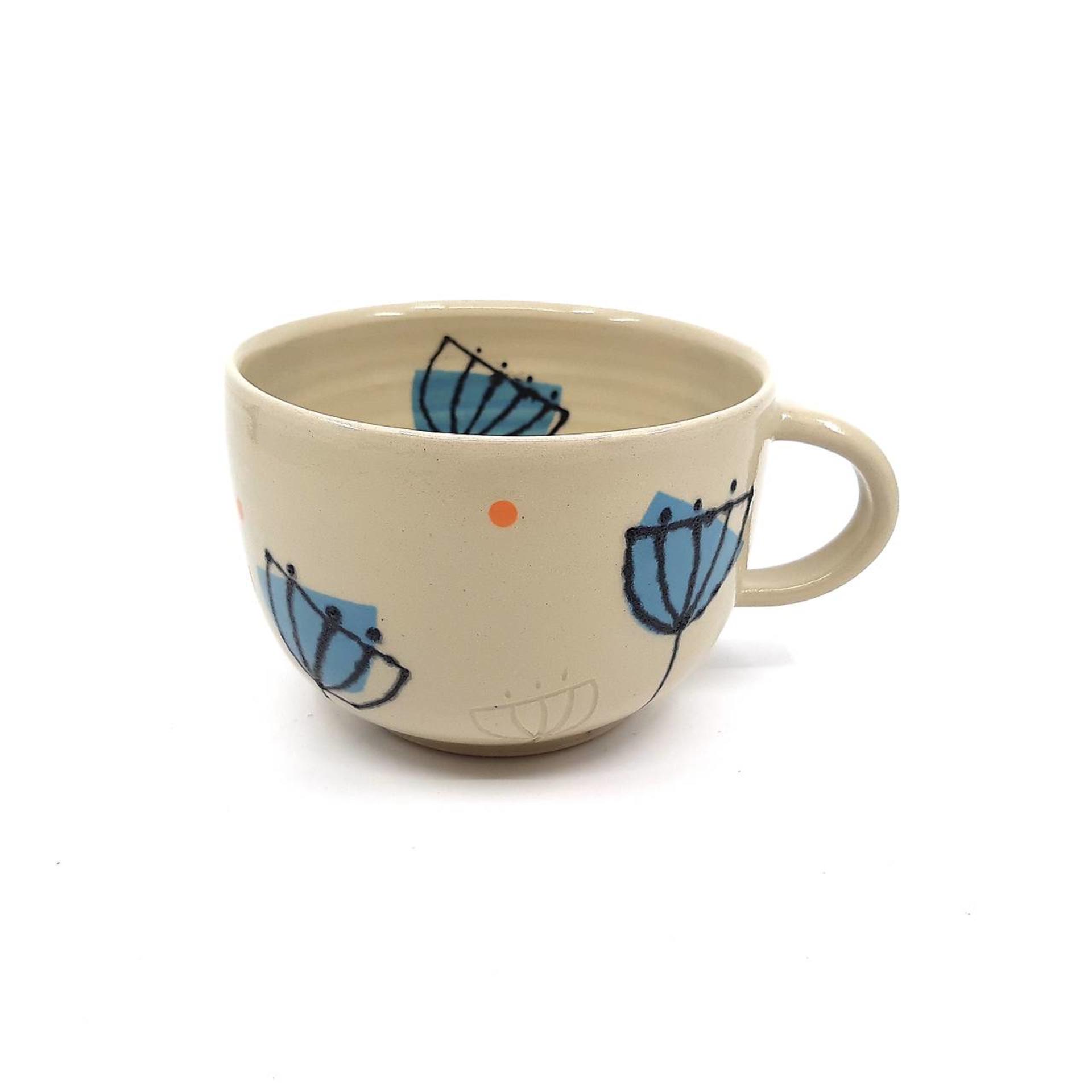 Šálka je kameninová, glazovaná rpeihľadnou glazúrou a vypálená oxidačným výpalom v elektrickej peci.