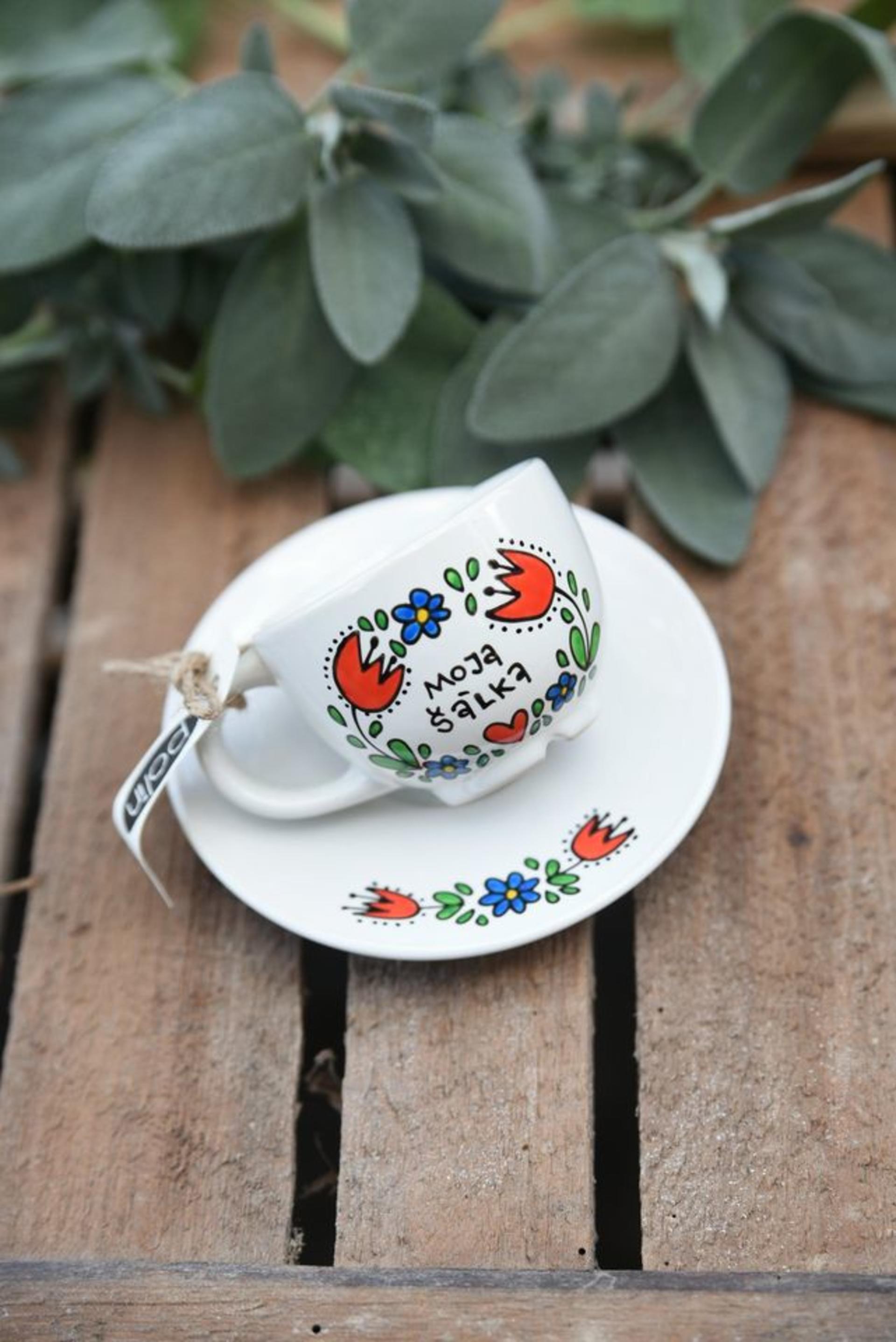 Keramická šálka s podšálkou, ručne maľovaná autorským vzorom od Polin.