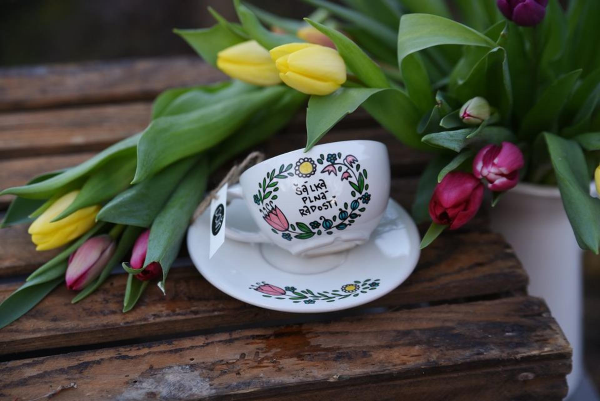 Keramická šálka s podšálkou, ručne maľovaná autorským vzorom od Polin.