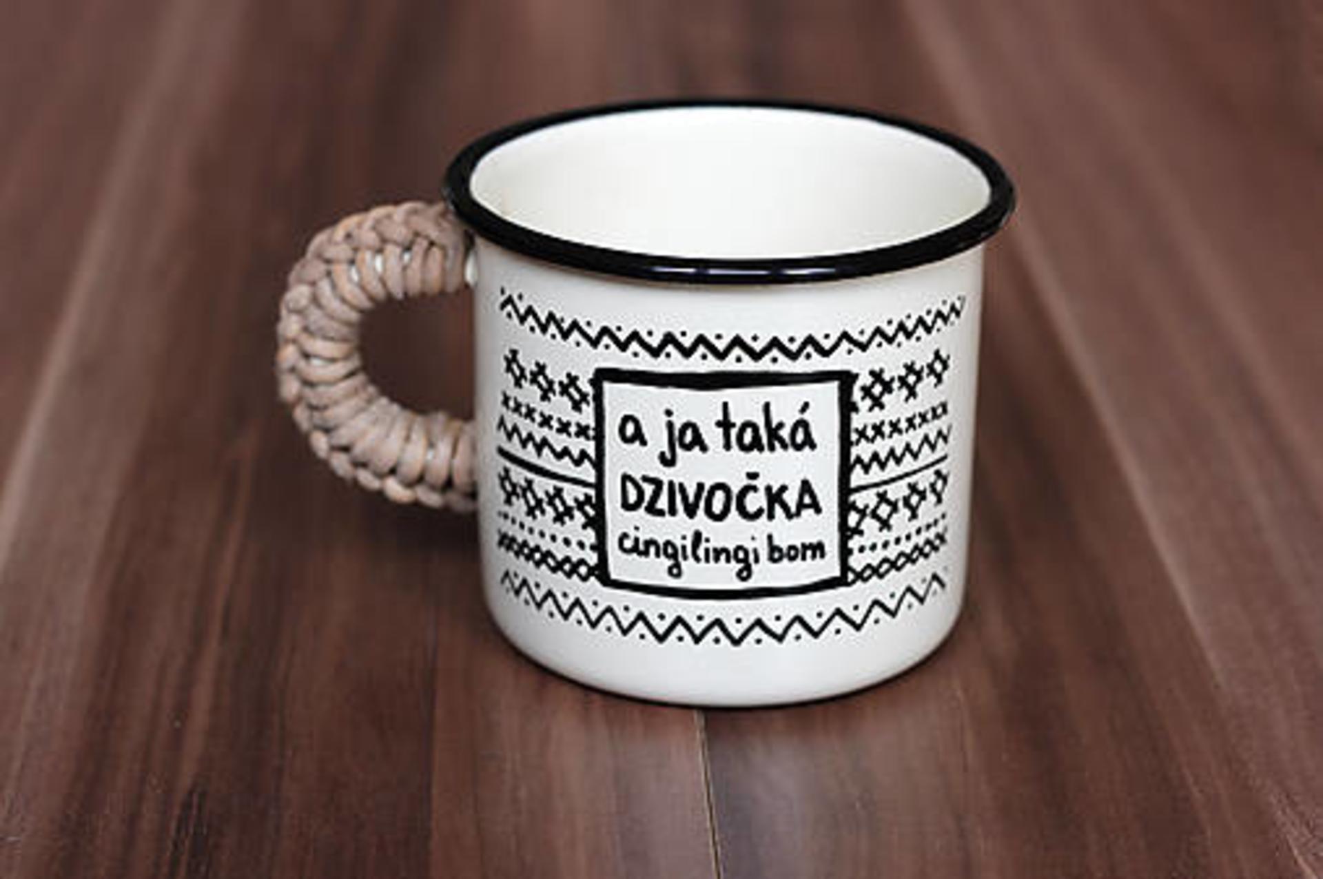 Bielo - čierny smaltovaný hrnček, na ktorom je nakreslená drobná kresbička.