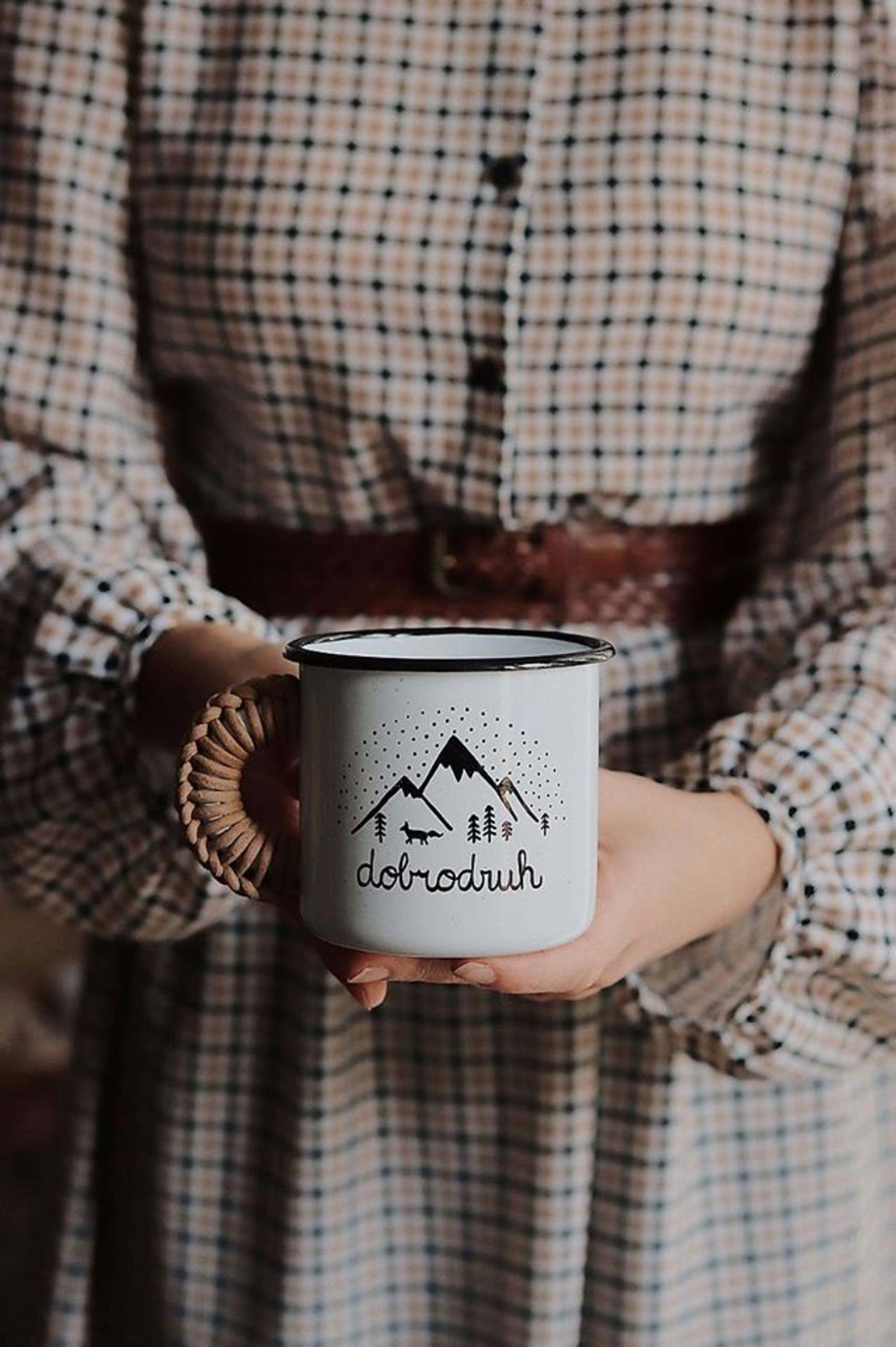 Bielo - čierny smaltovaný hrnček, na ktorom je nakreslená drobná kresbička.