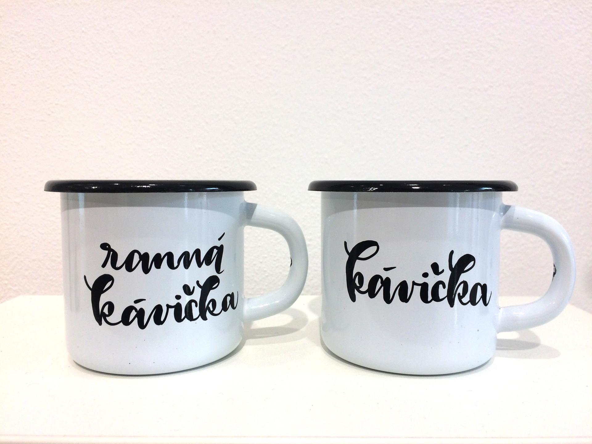 Biely smaltovaný hrnček, na ktorom je nakreslená drobná kresbička. Motív na hrnčeku je maľovaný čiernou fixou určenou na smaltovaný povrch. Fixovanou teplom.