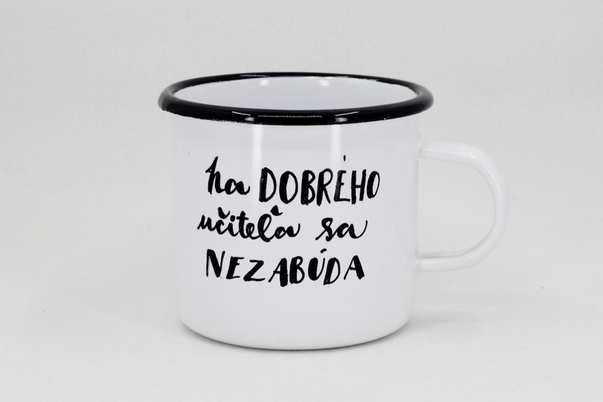 Bielo - čierny smaltovaný hrnček, na ktorom je nakreslená drobná kresbička.