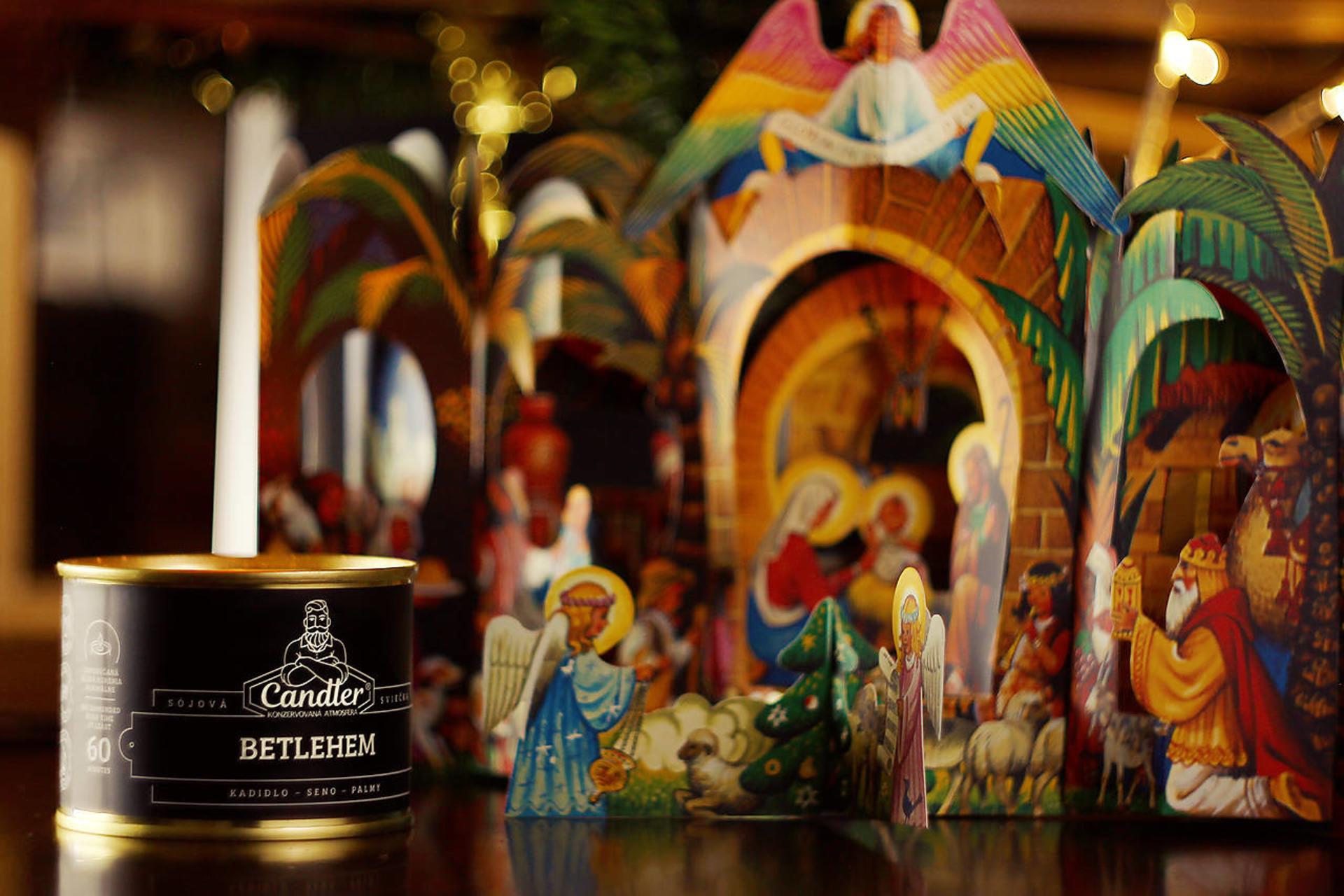 Sójová sviečka Betlehem s vôňou kadidla, sena a paliem zachytených na podklade ruževznikla na motív papierového vianočného betlehemu Vojtecha Kubaštu.
