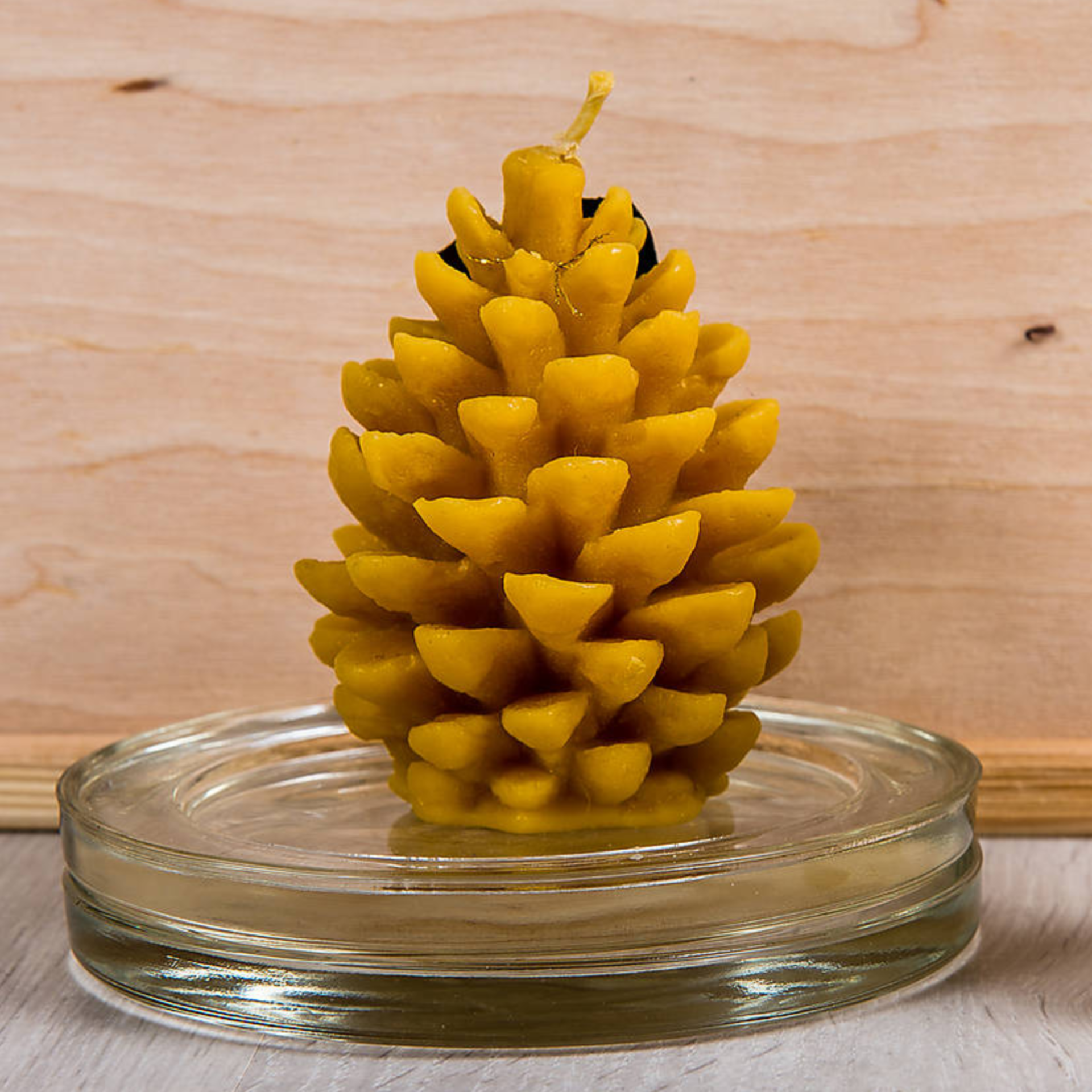 Odlievaná sviečka z včelieho vosku v tvare šišky.