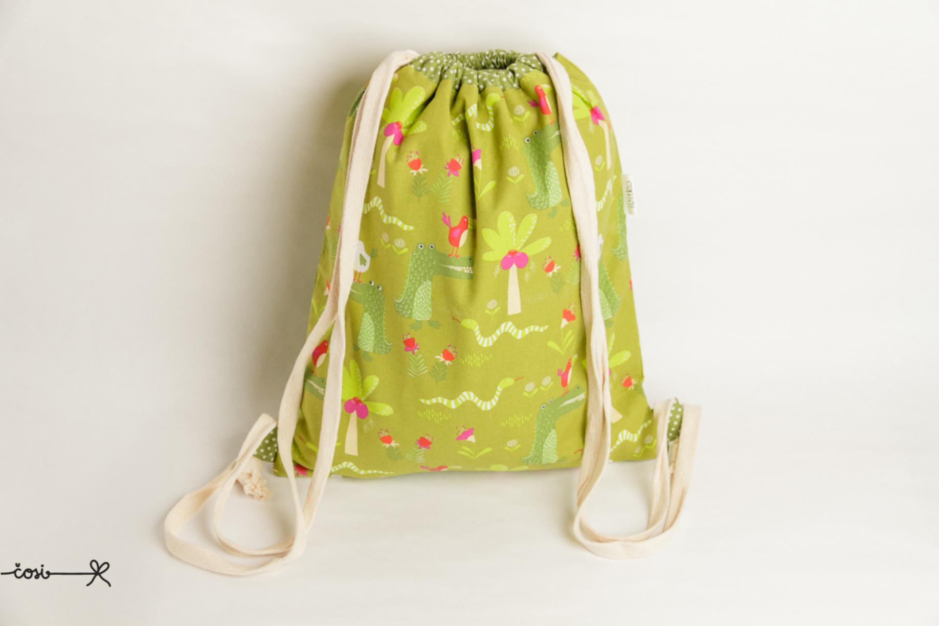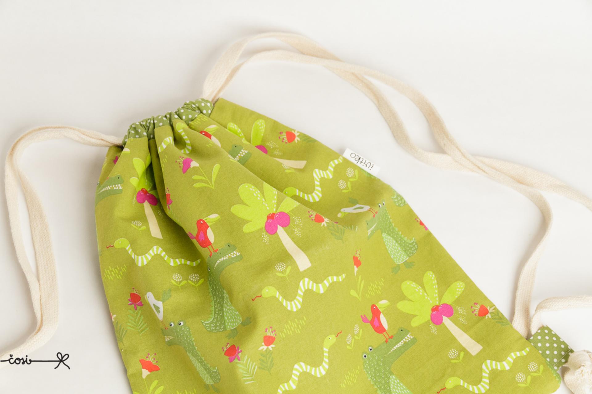 Detský bavlnený vak na zaťahovanie. Vak je podšitý - dvojvrstvový (vnútorná vrstva zelená bodkovaná bavlna).