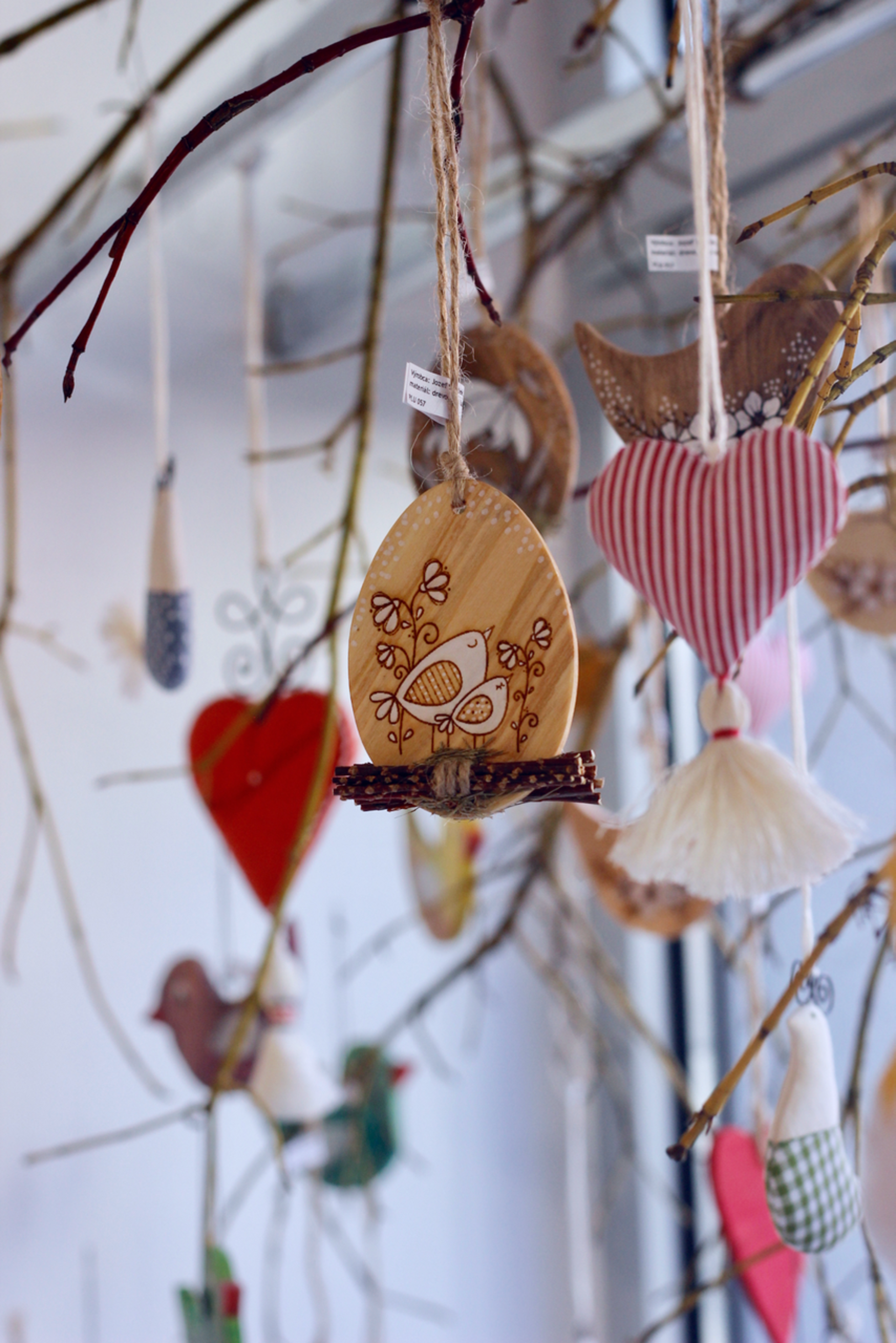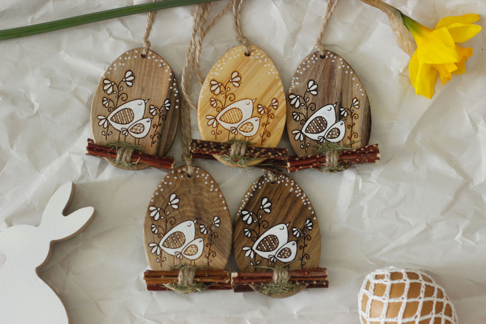 Drevená ozdoba vyrezávaná do tvoru vajíčka zo zvyškového dreva, následne vypaľovaný obrázok laserom a domaľovaný ručne fixou na drevo.
