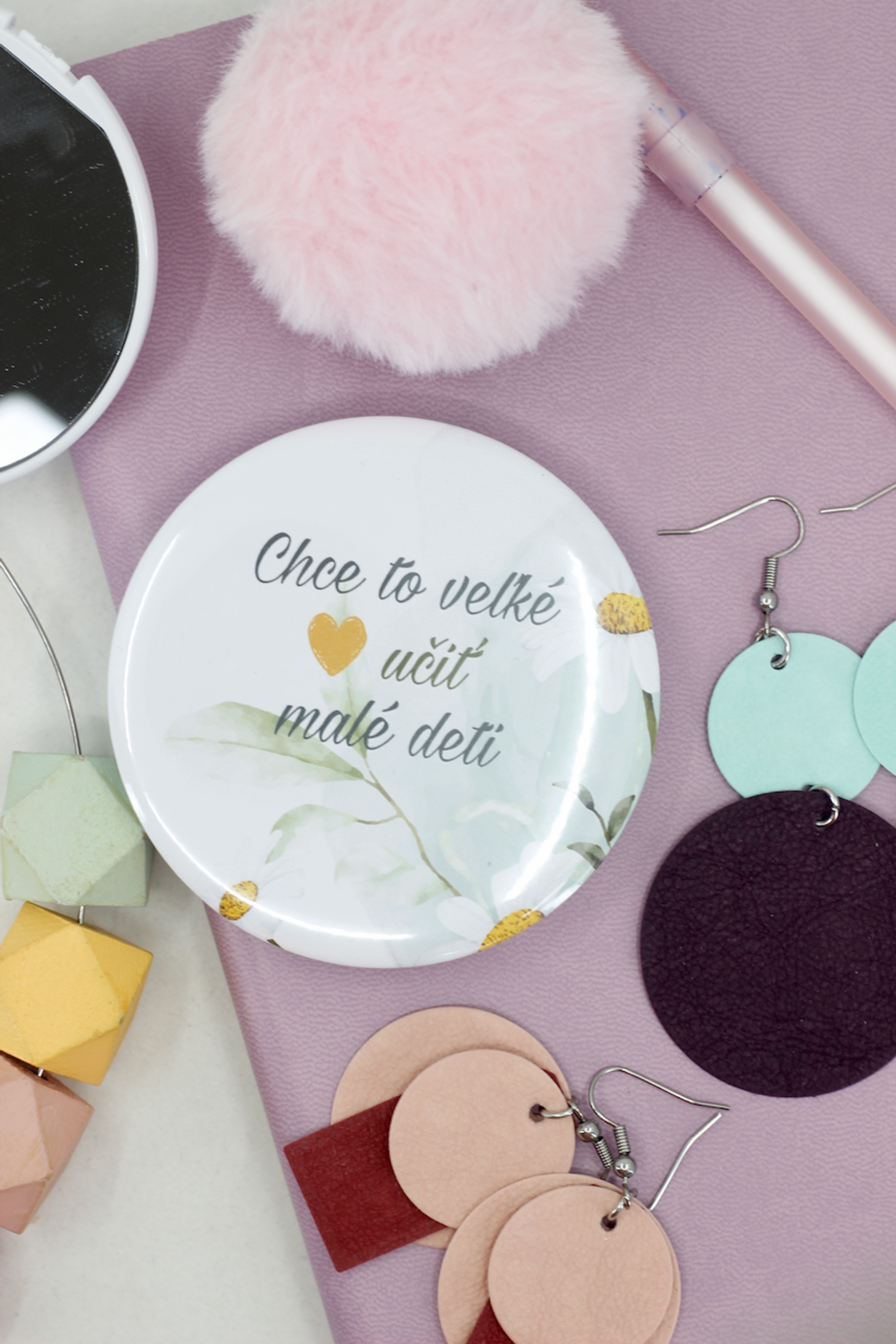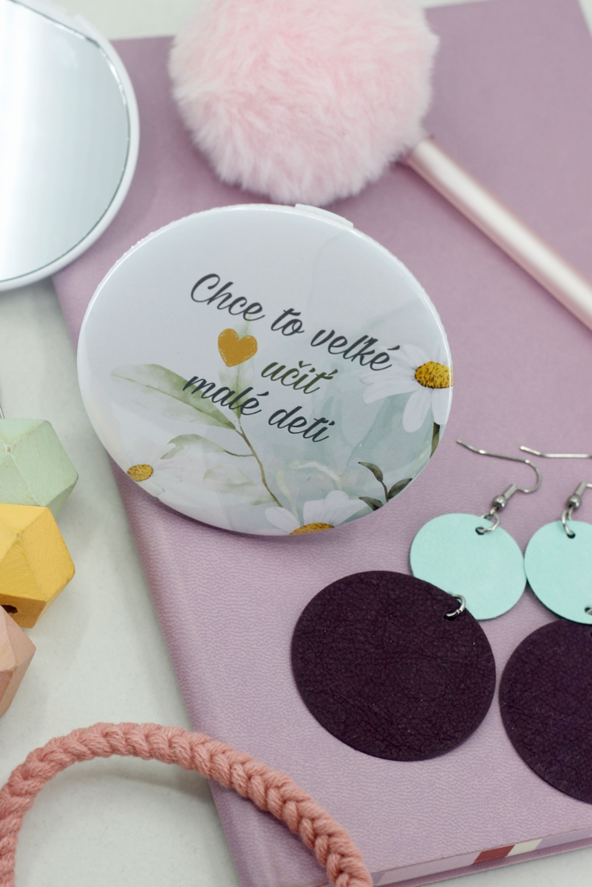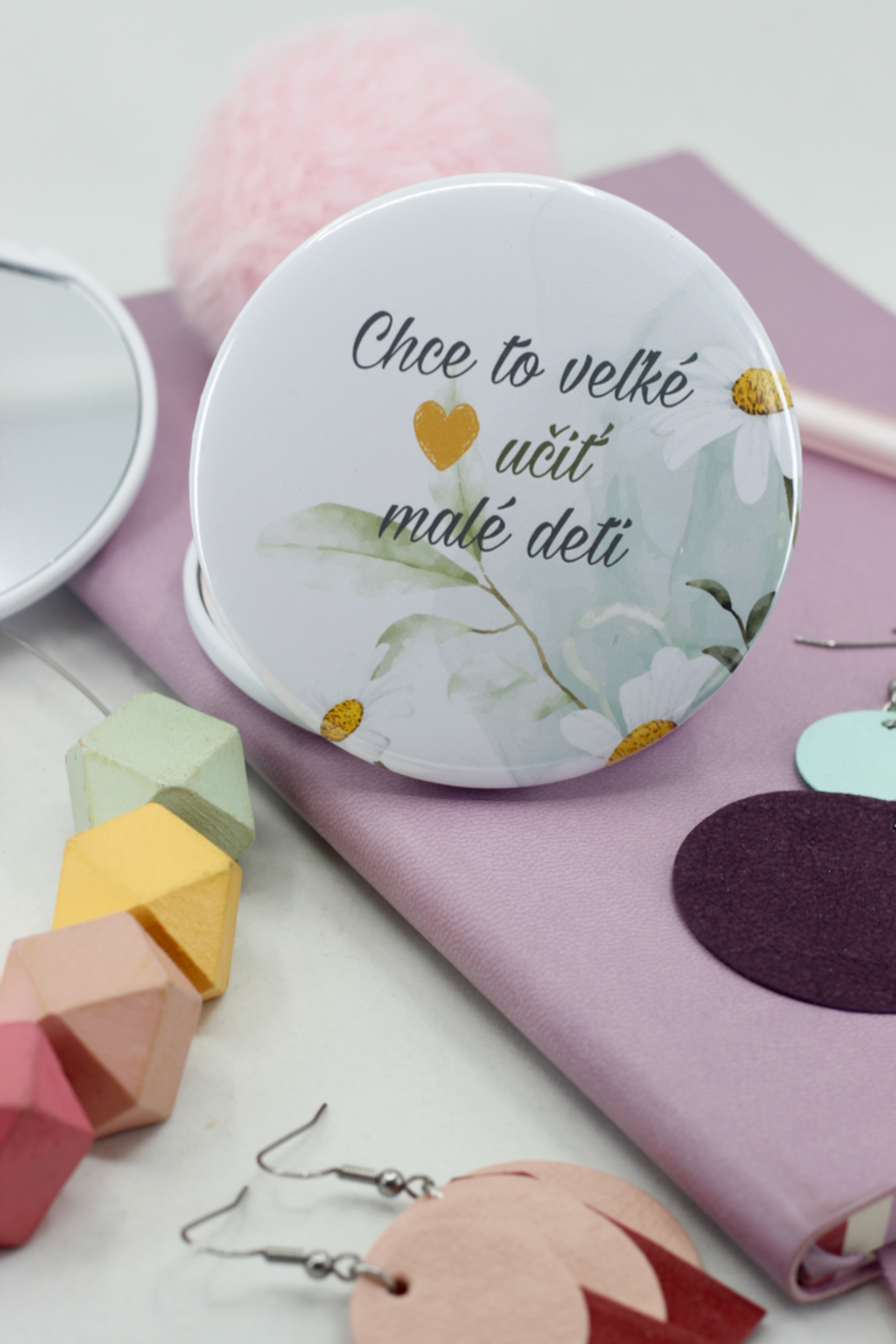 Zatváracie zrkadlo s krásnym textom pre pani učiteľku Chce to veľké srdce učiť malé deti, s romantickými kvetmi.